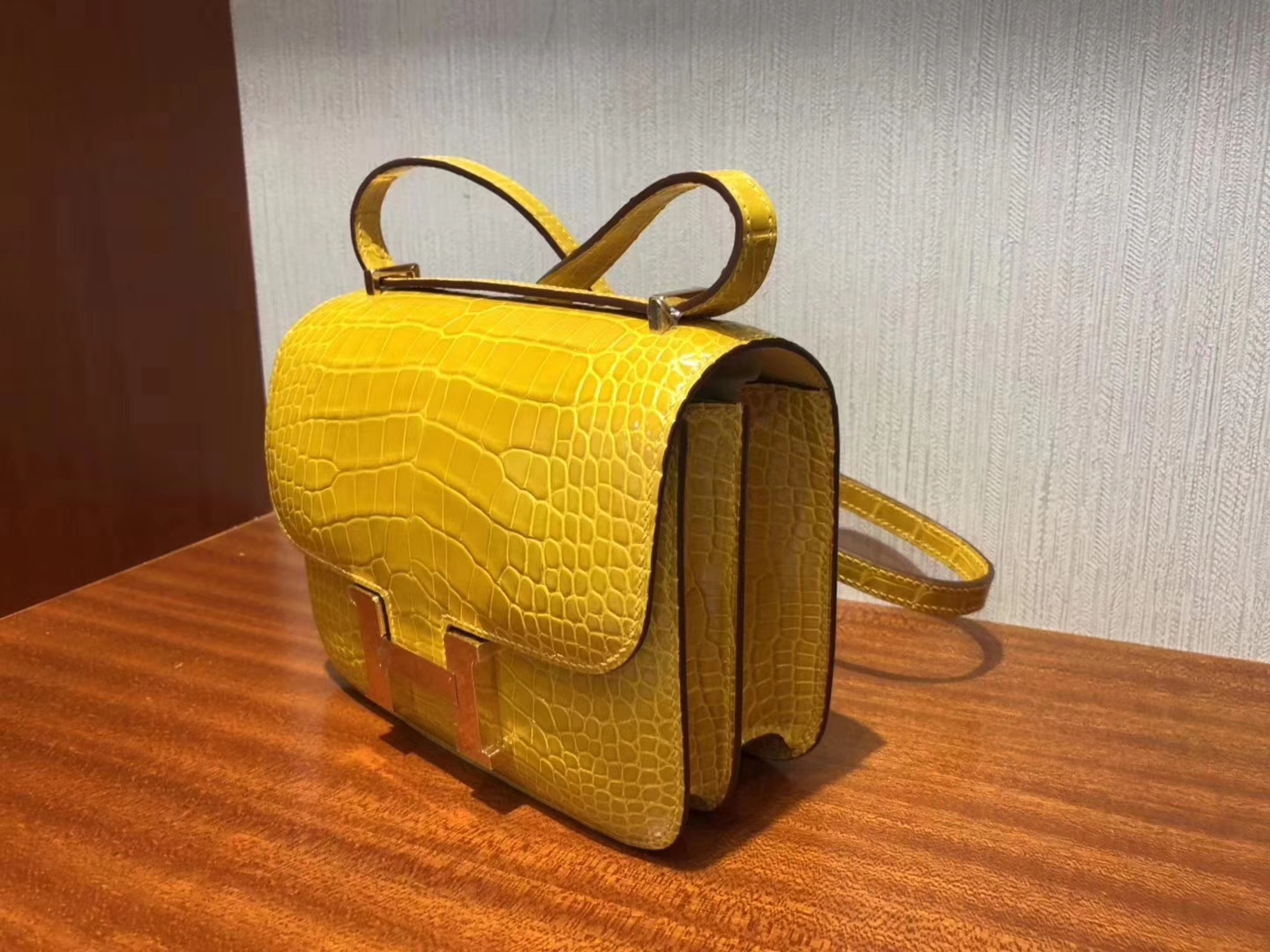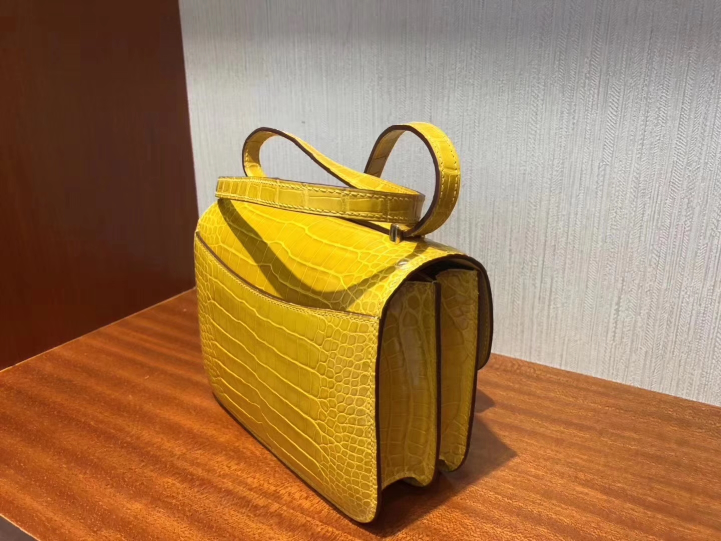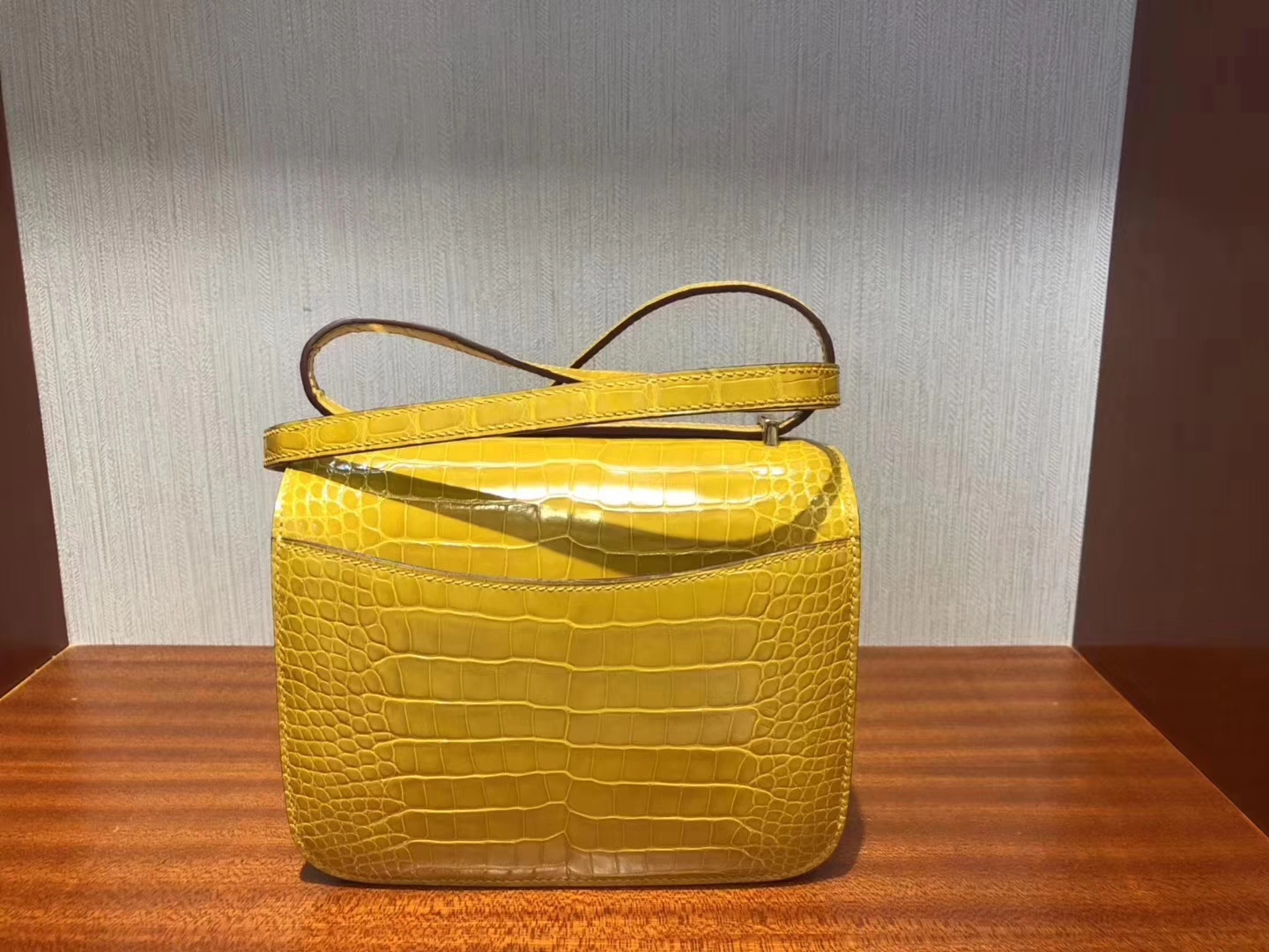 Hermès(爱马仕)Constance空姐包 Alligator shiny 亮面鳄鱼 9D琥珀黄 金扣 18cm 2019年8月5日 0 【鳄鱼世家】www.Eyubao.com Constance 18 Constance 空姐包 品牌:Hermès(爱马仕);类别:Constance 空姐包;颜色:琥珀黄;材质:亮面鳄鱼;等级:顶级;附件:全套包装礼盒;尺寸:18cm;功能:单肩背包