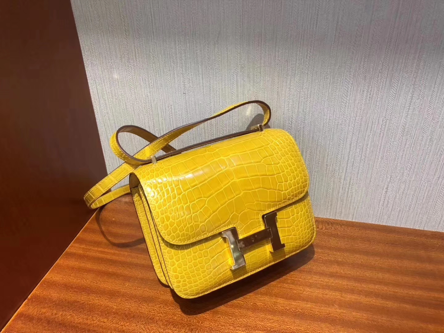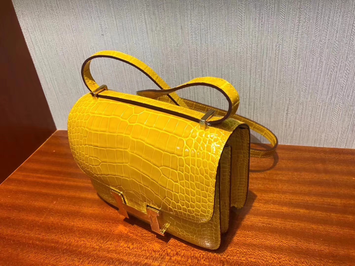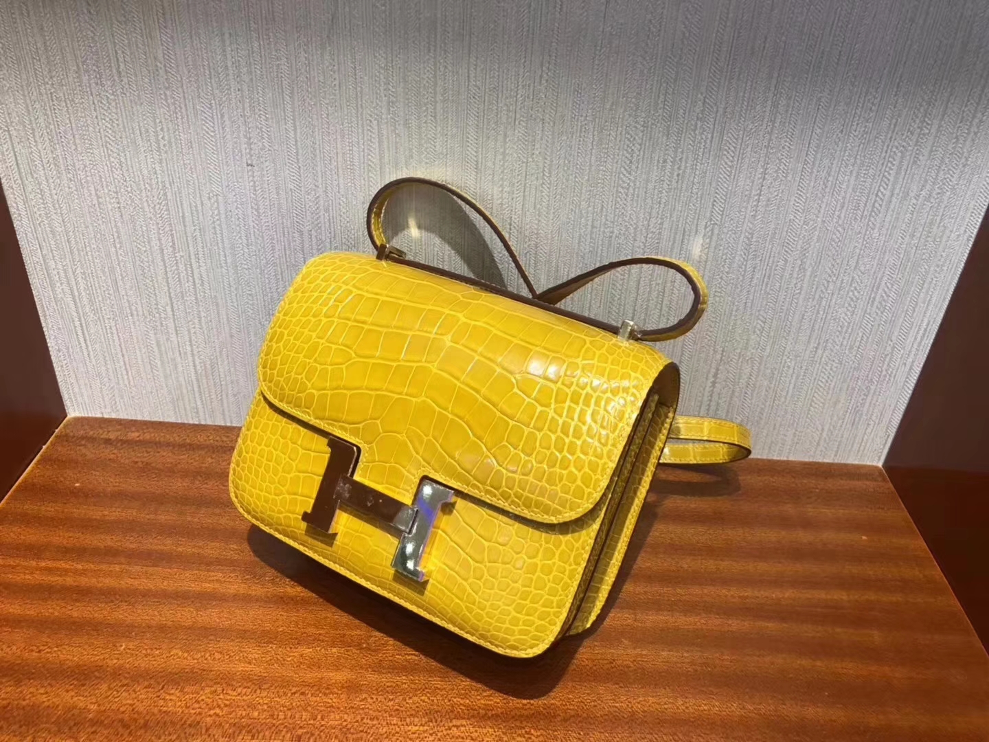 Hermès(爱马仕)Constance空姐包 Alligator shiny 亮面鳄鱼 9D琥珀黄 金扣 18cm 2019年8月5日 0 【鳄鱼世家】www.Eyubao.com Constance 18 Constance 空姐包 品牌:Hermès(爱马仕);类别:Constance 空姐包;颜色:琥珀黄;材质:亮面鳄鱼;等级:顶级;附件:全套包装礼盒;尺寸:18cm;功能:单肩背包