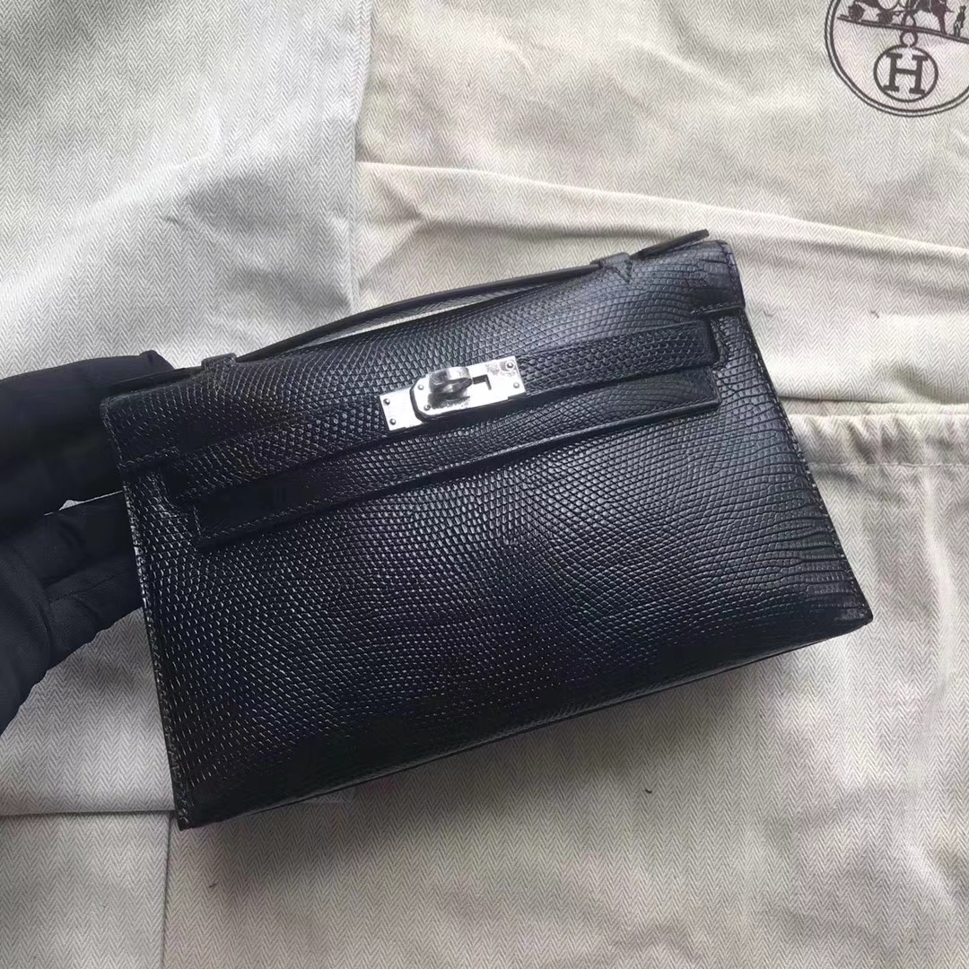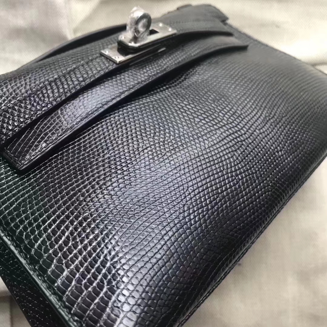 Hermès(爱马仕)Minikelly pochette 22cm Lizard 进口亮面蜥蜴 ck89 黑色 noir 银扣 手拿包 晚宴包 2019年8月9日 0 【鳄鱼世家】www.Eyubao.com Mini Kelly 1 Mini Kelly 迷你凯莉 品牌:Hermès(爱马仕);类别:Mini Kelly迷你凯莉包;颜色:黑色;材质:进口亮面蜥蜴;等级:顶级;附件:全套包装礼盒;尺寸:22cm;功能:手提单肩包