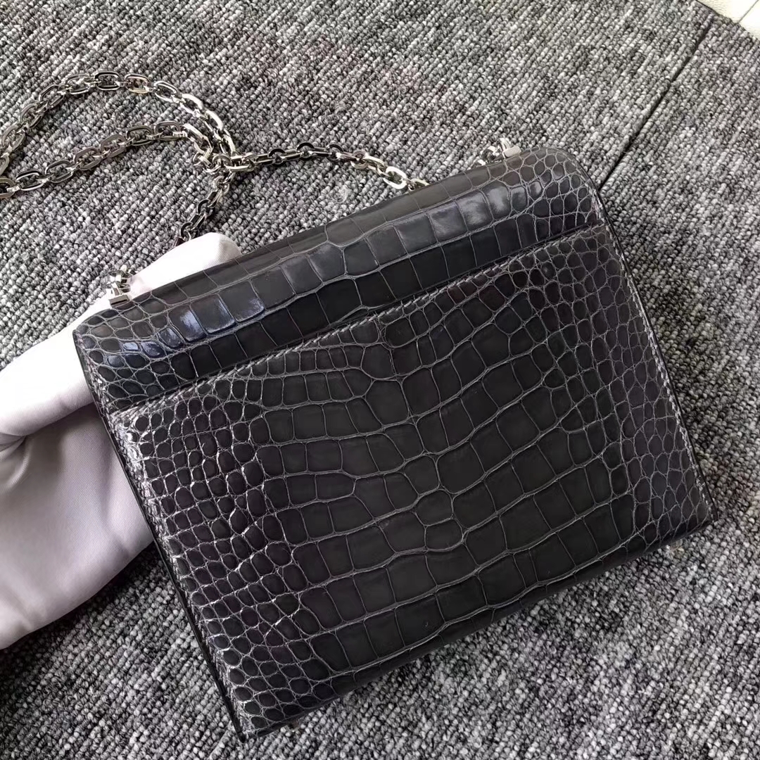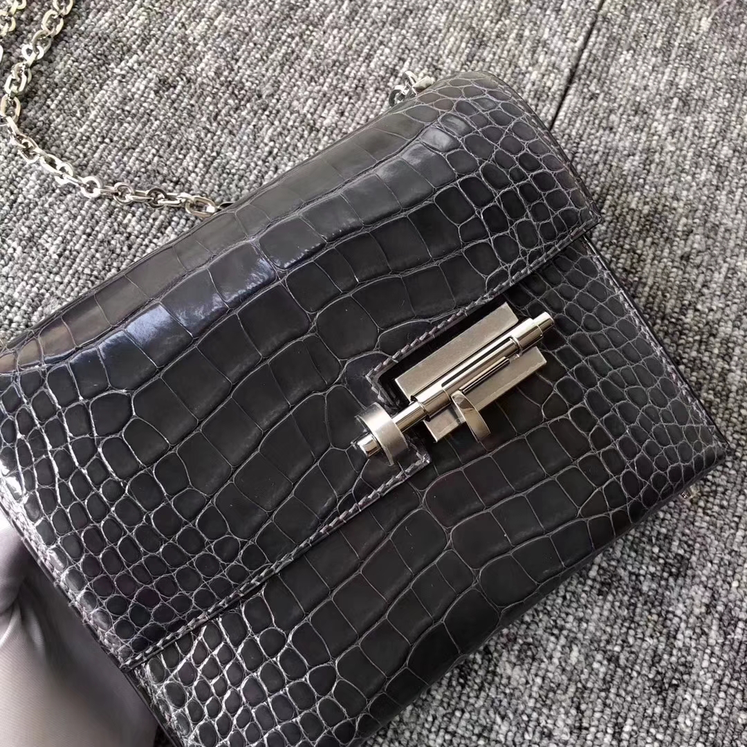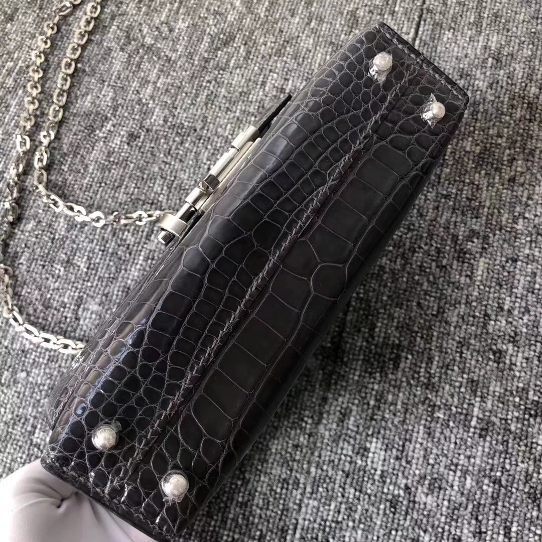 Hermès(爱马仕)定制款!Verrou17.5cm 手枪包 Alligator shiny 亮面鳄鱼 ck88 石墨灰 graphite 银扣 2019年8月30日 0 【鳄鱼世家】www.Eyubao.com Verrou 机关枪 品牌:Hermès(爱马仕);类别:Verrou 插销包;颜色:石墨灰;材质:美洲亮面鳄鱼;等级:顶级;附件:全套包装礼盒;尺寸:17.5cm;功能:手提单肩包