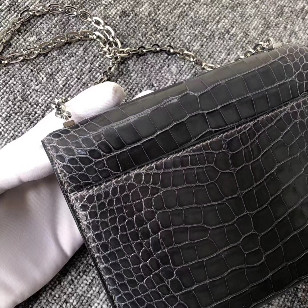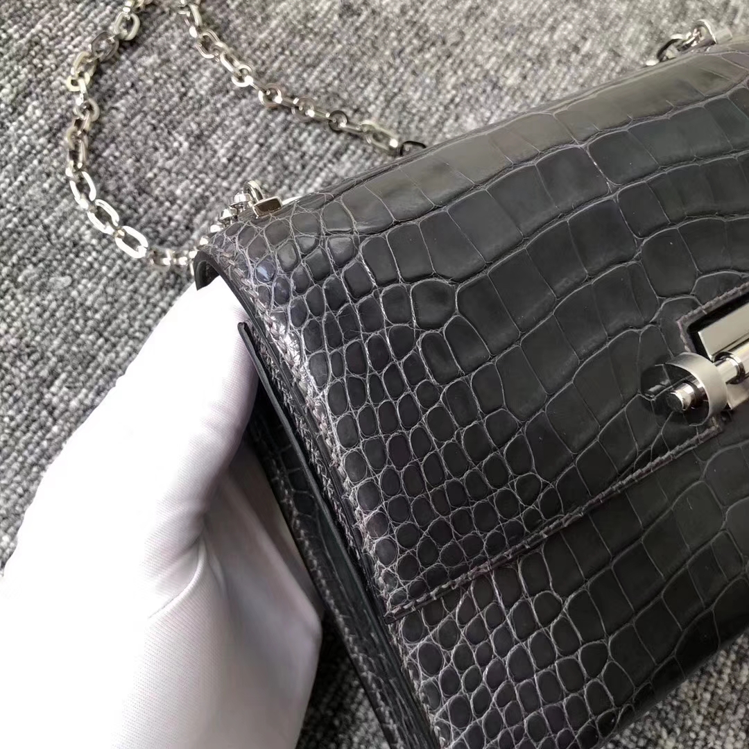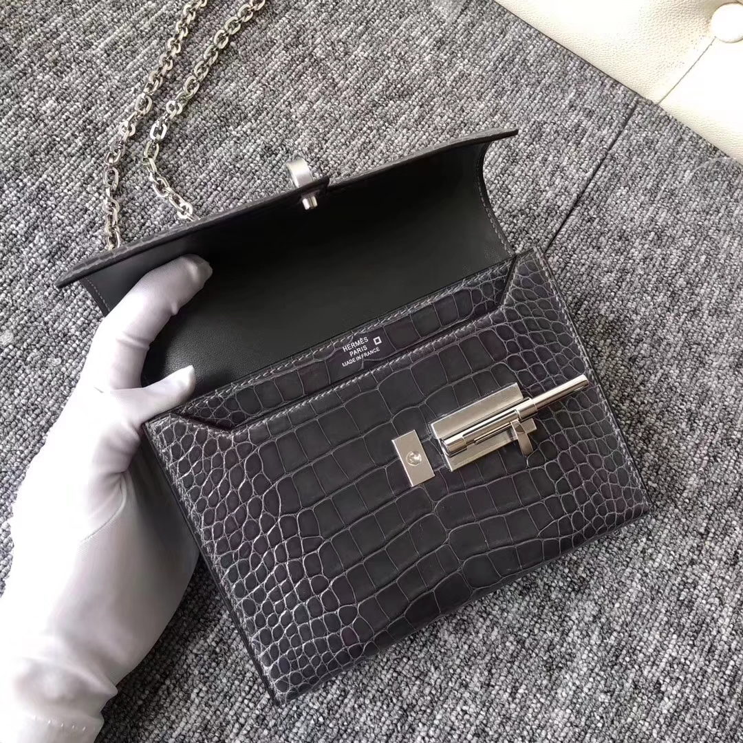 Hermès(爱马仕)定制款!Verrou17.5cm 手枪包 Alligator shiny 亮面鳄鱼 ck88 石墨灰 graphite 银扣 2019年8月30日 0 【鳄鱼世家】www.Eyubao.com Verrou 机关枪 品牌:Hermès(爱马仕);类别:Verrou 插销包;颜色:石墨灰;材质:美洲亮面鳄鱼;等级:顶级;附件:全套包装礼盒;尺寸:17.5cm;功能:手提单肩包