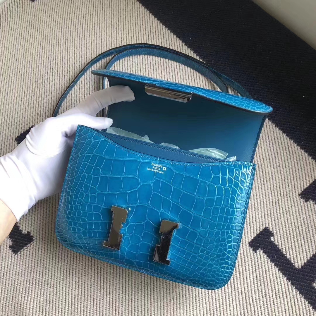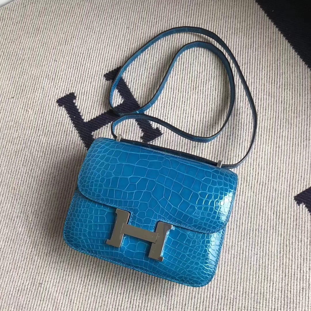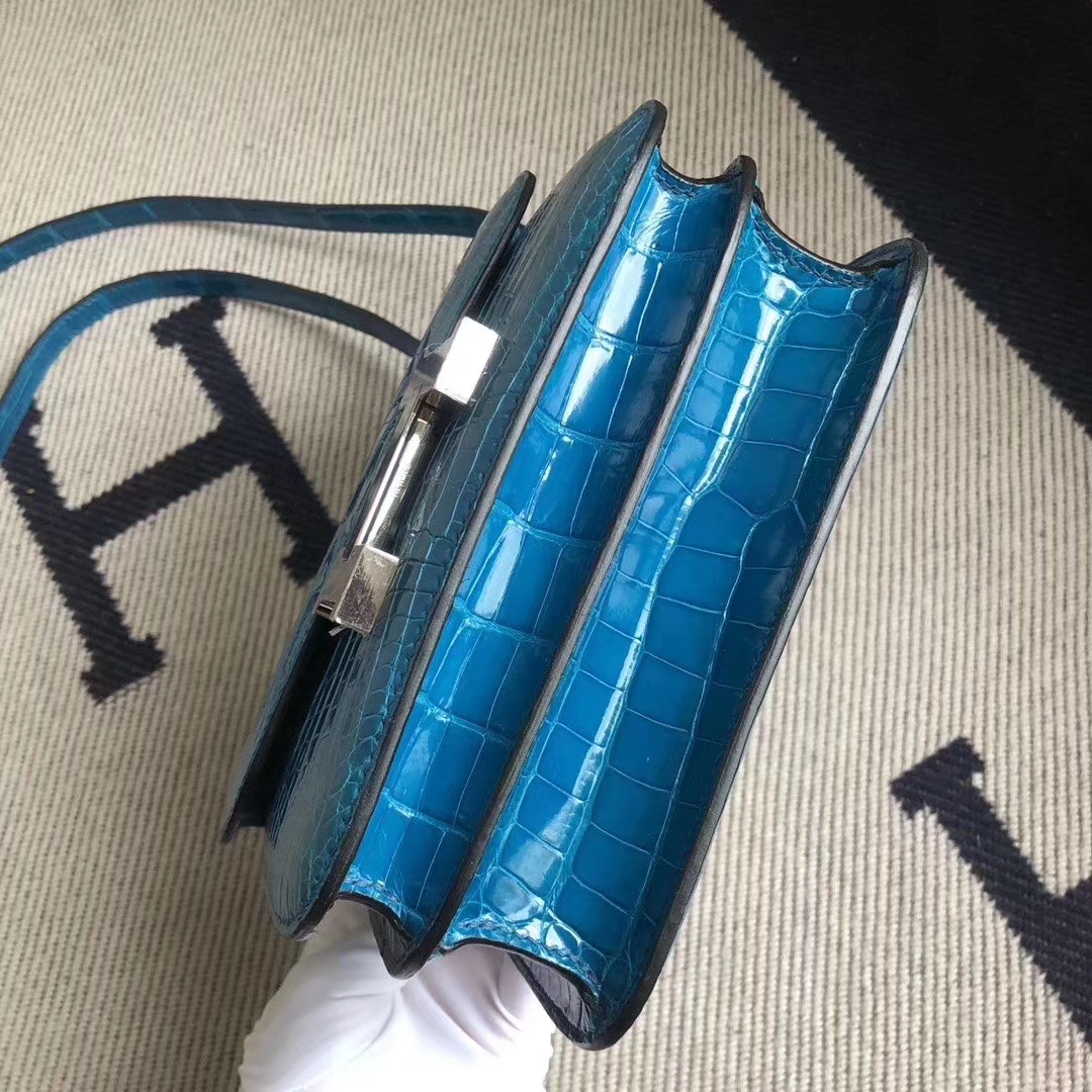 Hermès(爱马仕)Constance 空姐包 亮面方块 美洲鳄鱼 7W伊兹密尔蓝 Blue izmir 完美品相 银扣 19cm