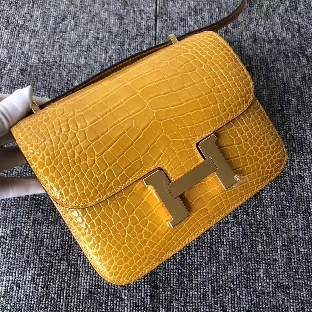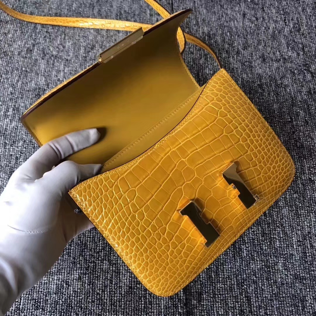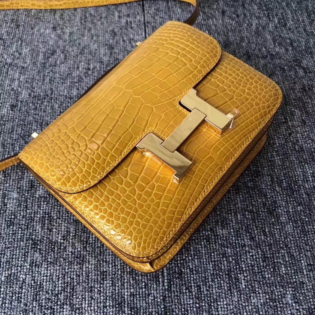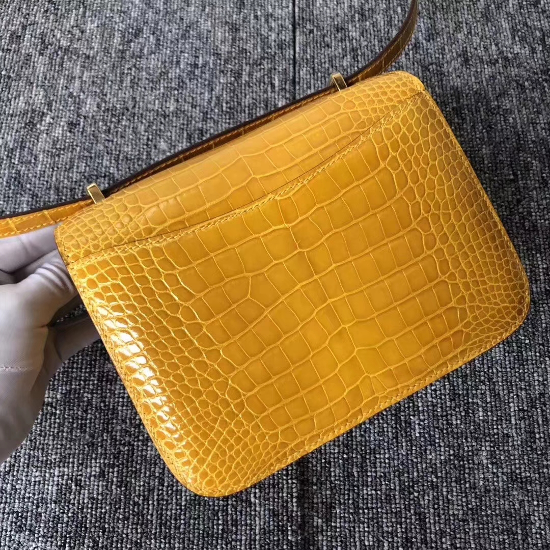 Hermès(爱马仕)Constance 空姐包 Alligator shiny 亮面鳄鱼 9D 琥珀黄 Ambre 金扣 18cm 现货 2019年11月7日 0 【鳄鱼世家】www.Eyubao.com Constance 18 Constance 空姐包 品牌:Hermès(爱马仕);类别:Constance 空姐包;颜色:琥珀黄;材质:亮面框框美洲鳄;等级:顶级;附件:全套包装礼盒;尺寸:18cm;功能:单肩背包
