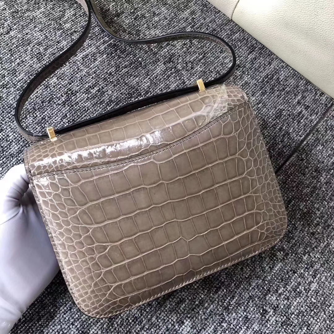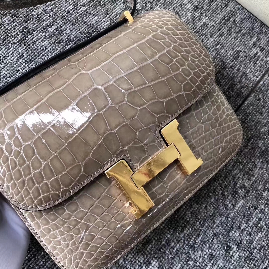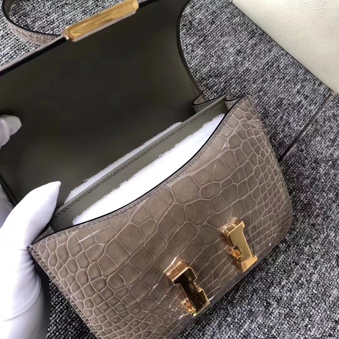 Hermès(爱马仕)Constance 空姐包 Alligator shiny 亮面鳄鱼 ck81 斑鸠灰 金扣 18cm 现货 2019年11月7日 0 【鳄鱼世家】www.Eyubao.com Constance 18 Constance 空姐包 品牌:Hermès(爱马仕);类别:Constance 空姐包;颜色:斑鸠灰;材质:亮面鳄鱼;等级:顶级;附件:全套包装礼盒;尺寸:18cm;功能:单肩背包