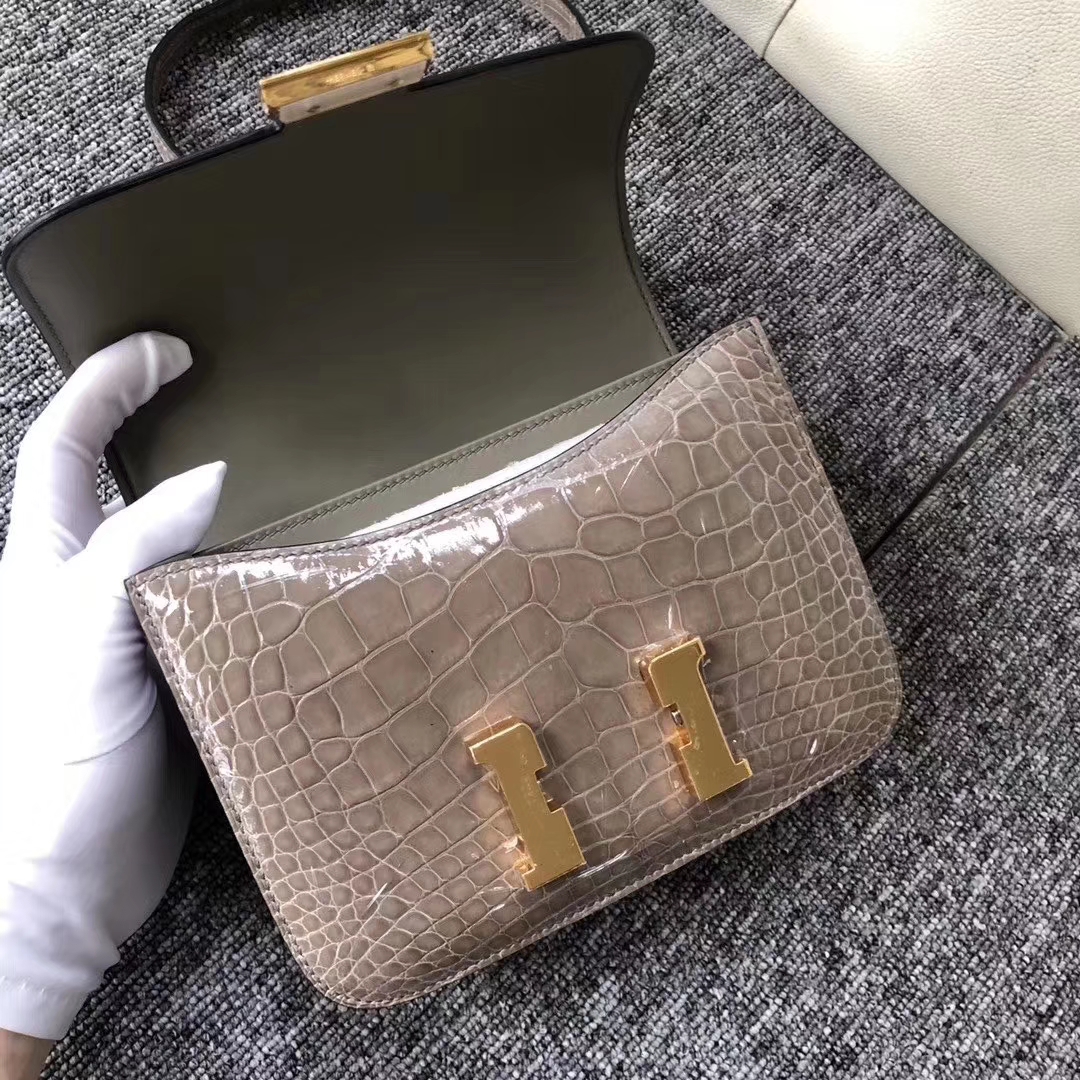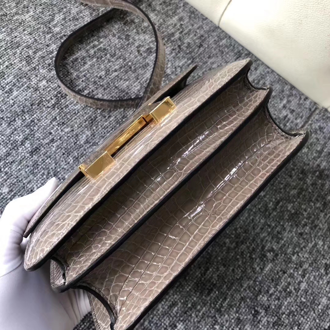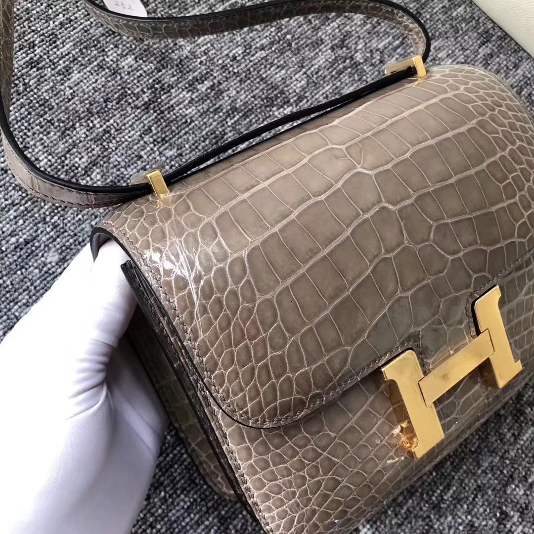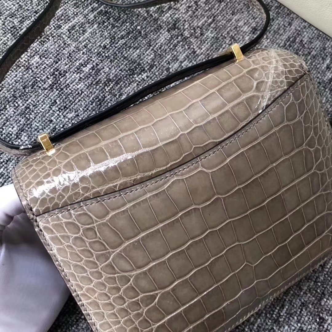 Hermès(爱马仕)Constance 空姐包 Alligator shiny 亮面鳄鱼 ck81 斑鸠灰 金扣 18cm 现货 2019年11月7日 0 【鳄鱼世家】www.Eyubao.com Constance 18 Constance 空姐包 品牌:Hermès(爱马仕);类别:Constance 空姐包;颜色:斑鸠灰;材质:亮面鳄鱼;等级:顶级;附件:全套包装礼盒;尺寸:18cm;功能:单肩背包