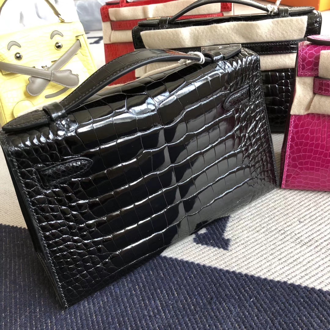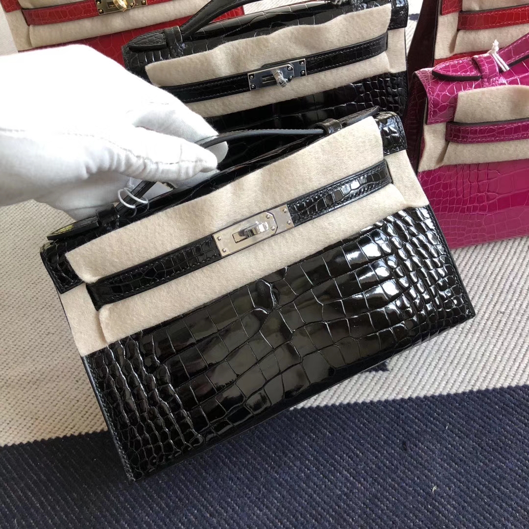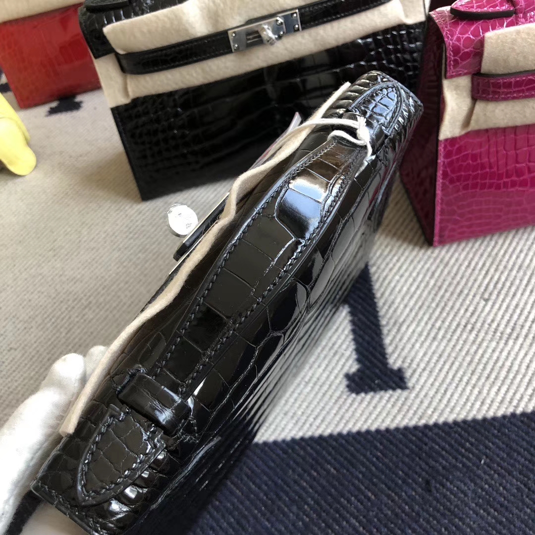 Hermès(爱马仕)Minikelly pochette 22cm Alligator shiny 亮面鳄鱼 ck89黑色 Noir 银扣 手拿包 晚宴包 2019年12月7日 0 【鳄鱼世家】www.Eyubao.com Mini Kelly 1 Mini Kelly 迷你凯莉 品牌:Hermès(爱马仕);类别:Mini Kelly迷你凯莉包;颜色:黑色;材质:亮面框框美洲鳄;等级:顶级;附件:全套包装礼盒;尺寸:22cm;功能:手提单肩包