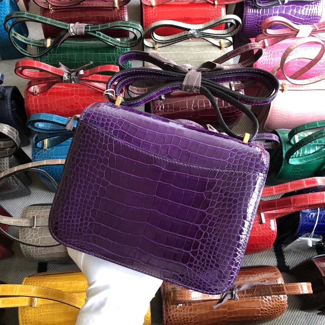 Hermès(爱马仕)Constance 空姐包 18cm Alligator shiny 亮面鳄鱼 9G 紫水晶 金扣 现货 2019年12月8日 0 【鳄鱼世家】www.Eyubao.com Constance 18 Constance 空姐包 品牌:Hermès(爱马仕);类别:Constance 空姐包;颜色:紫水晶;材质:亮面鳄鱼;等级:顶级;附件:全套包装礼盒;尺寸:18cm;功能:单肩背包