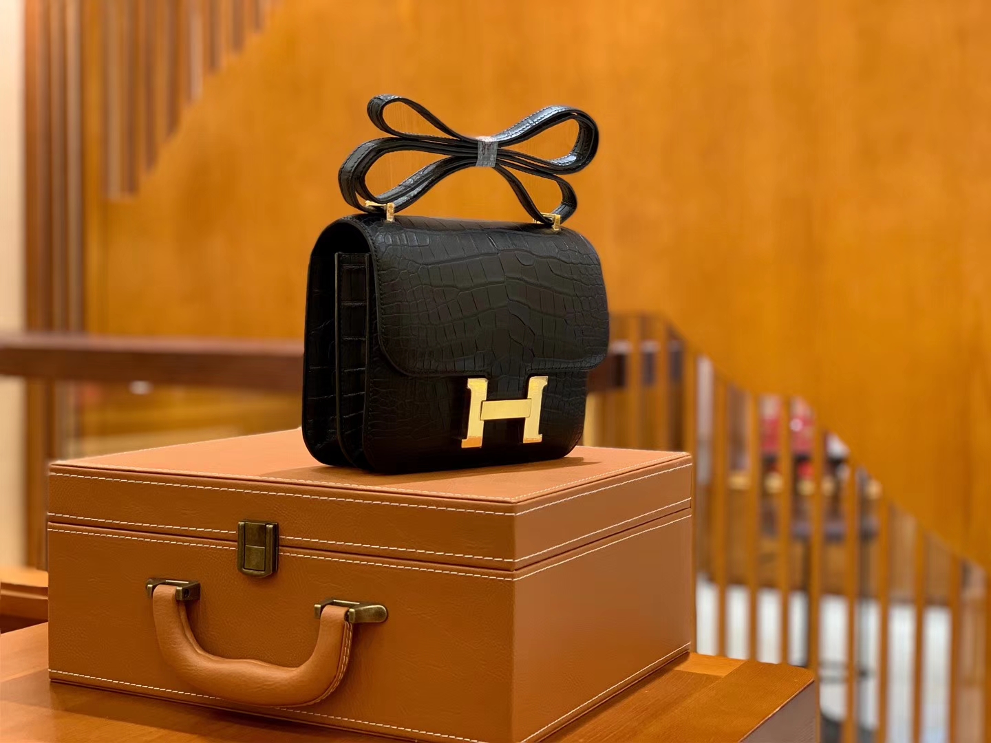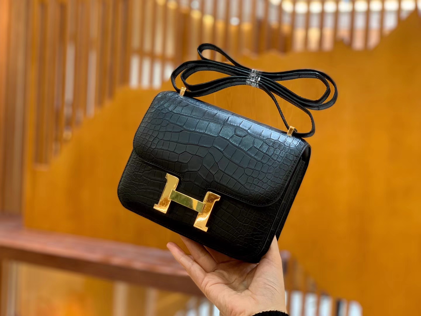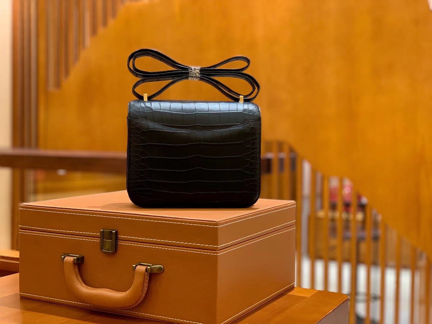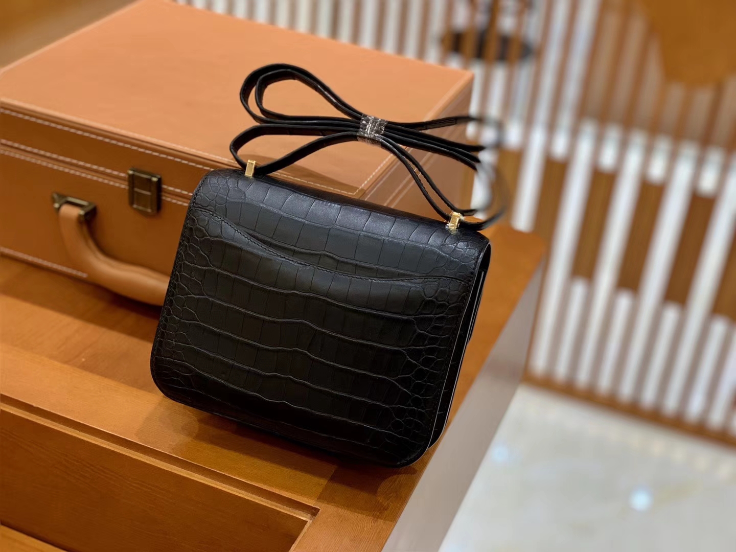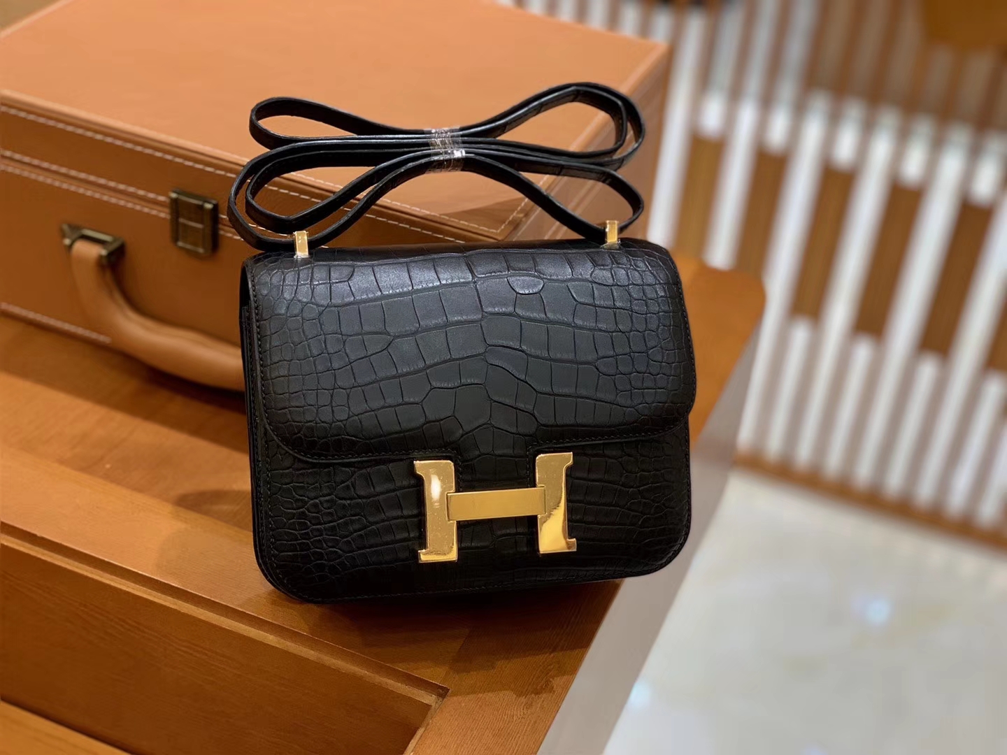 Hermès(爱马仕)Constance 18cm 经典黑 金扣 美洲雾面鳄鱼皮 全手工缝制 2019年12月13日 0 【鳄鱼世家】www.Eyubao.com Constance 18 Constance 空姐包 品牌:Hermès(爱马仕);类别:Constance 空姐包;颜色:经典黑;材质:美洲雾面鳄鱼皮;等级:顶级;附件:全套包装礼盒;尺寸:18cm;功能:单肩背包