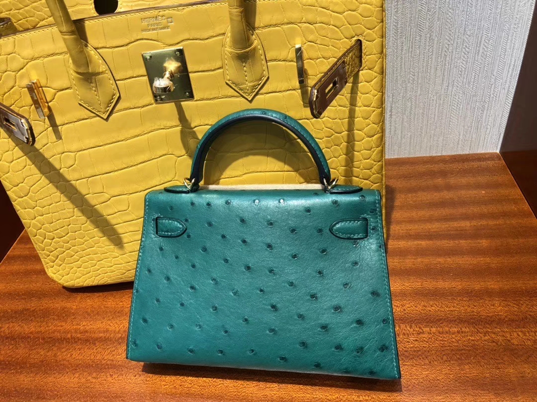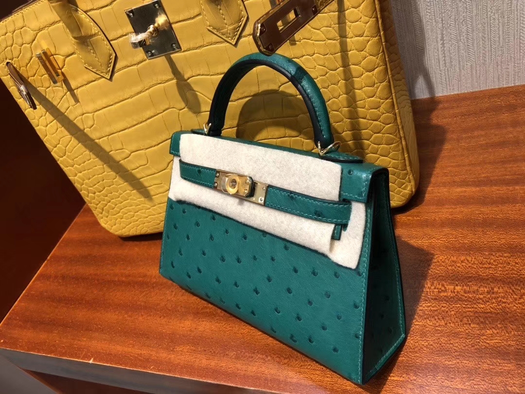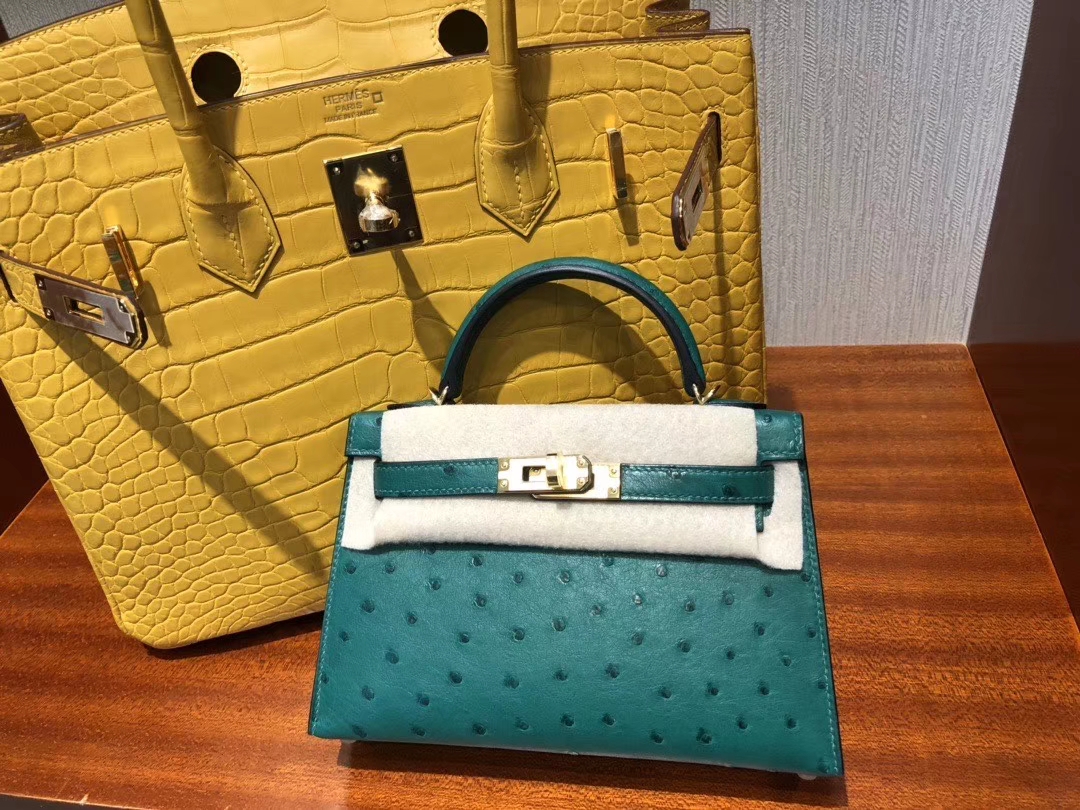 Hermès(爱马仕)Minikelly ll Ostrich kk鸵鸟 孔雀绿 金扣 顶级手缝 现货 2019年12月14日 0 【鳄鱼世家】www.Eyubao.com Mini Kelly 2 Mini Kelly 迷你凯莉 品牌:Hermès(爱马仕);类别:Mini Kelly 迷你凯莉;颜色:孔雀绿;材质:鸵鸟皮;等级:顶级;附件:全套包装礼盒;尺寸:19cm;功能:手提单肩包