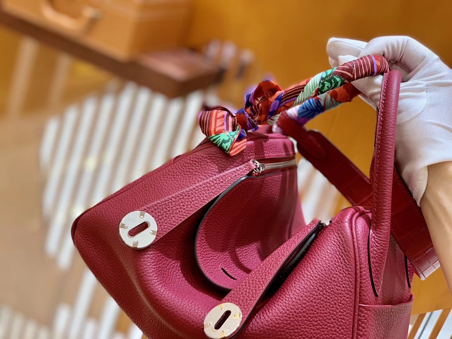 Hermès(爱马仕)Lindy 26cm 石榴红 银扣 鳄鱼皮拼togo 全手工缝制 2019年12月24日 0 【鳄鱼世家】www.Eyubao.com Lindy 26 Lindy 琳迪包 品牌:Hermès(爱马仕);类别:Lindy 琳迪包;颜色:石榴红;材质:鳄鱼皮拼牛皮 togo;等级:顶级;附件:全套包装礼盒;尺寸:26cm;功能:手提单肩包