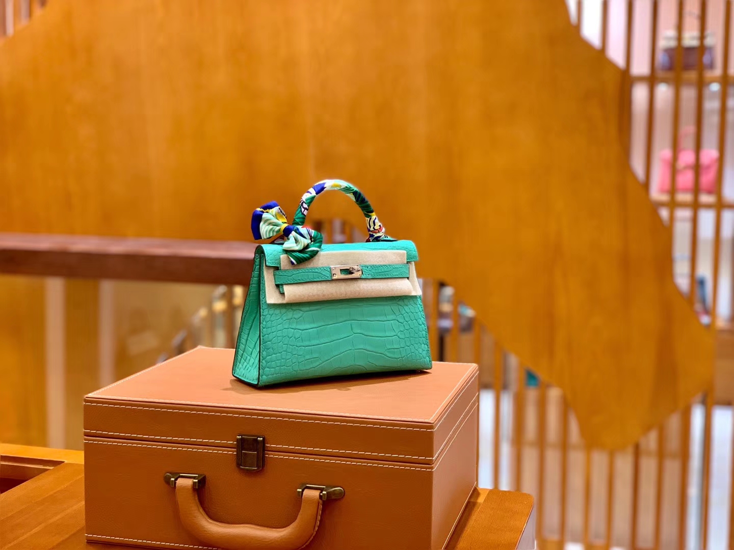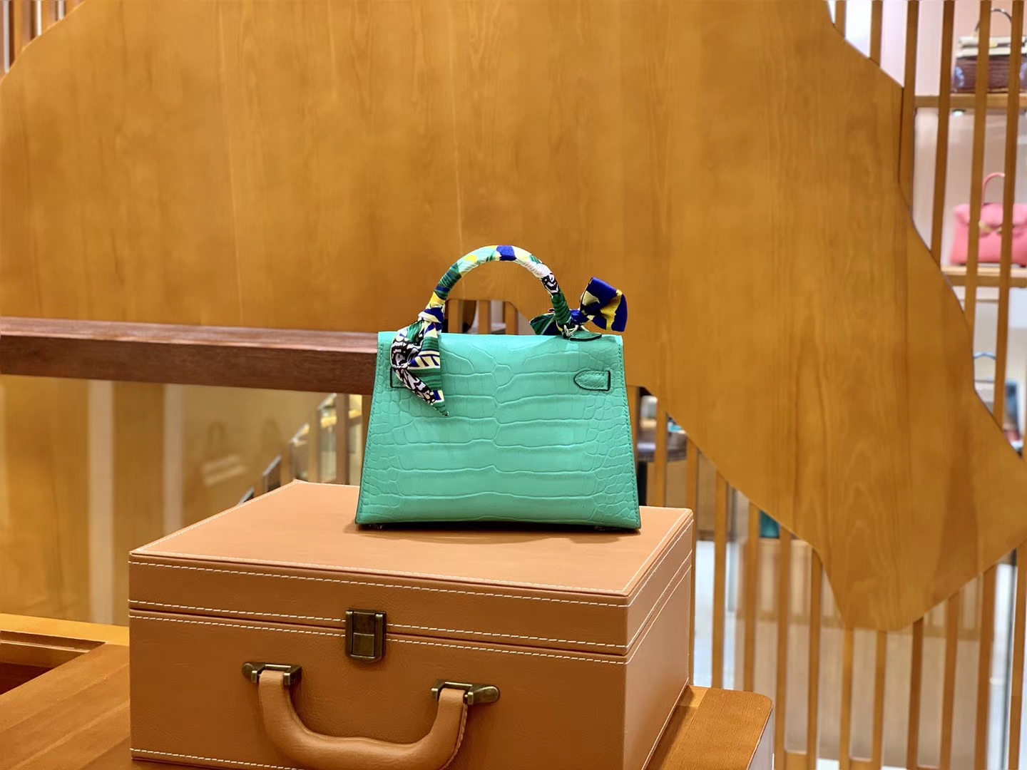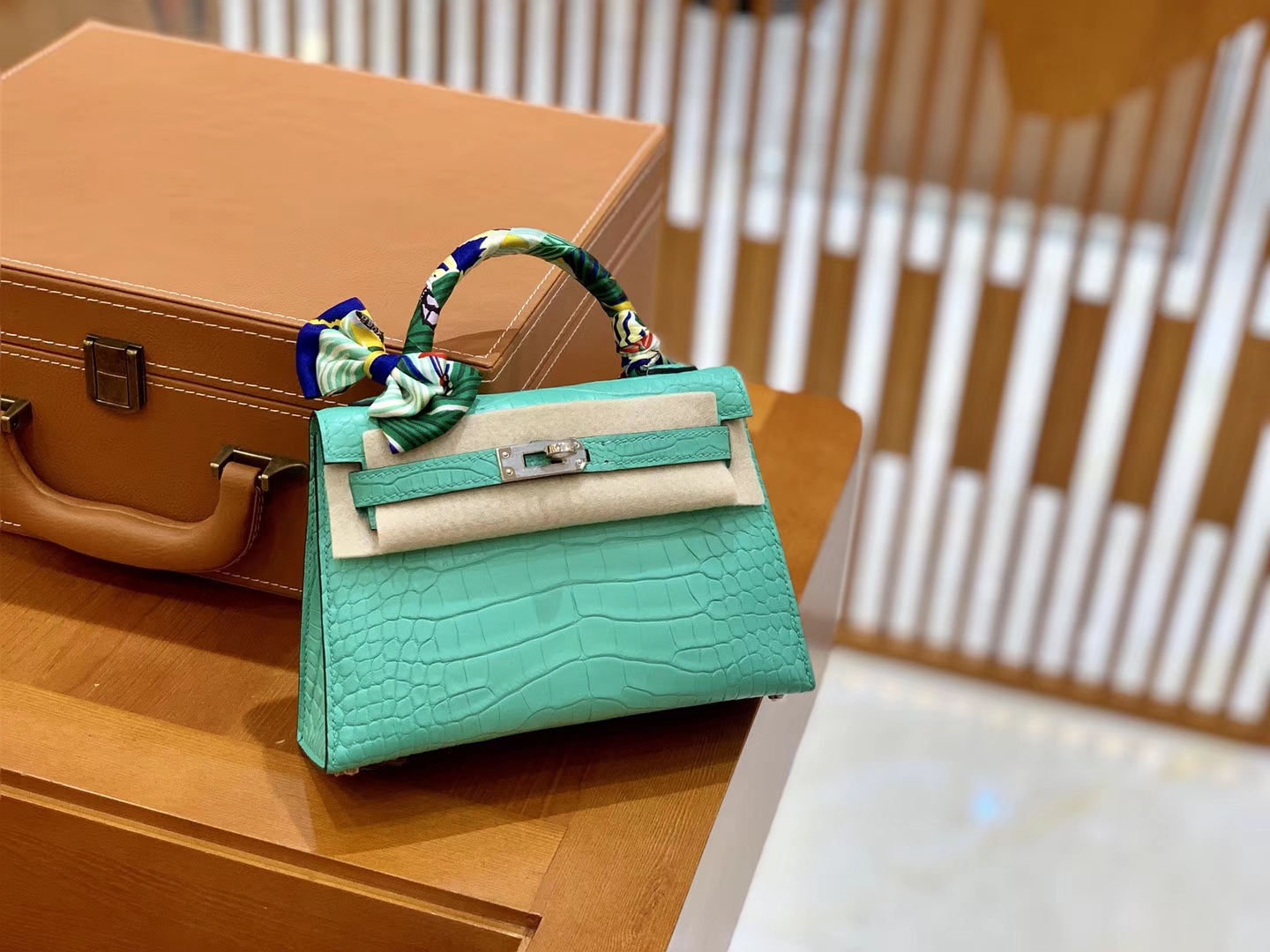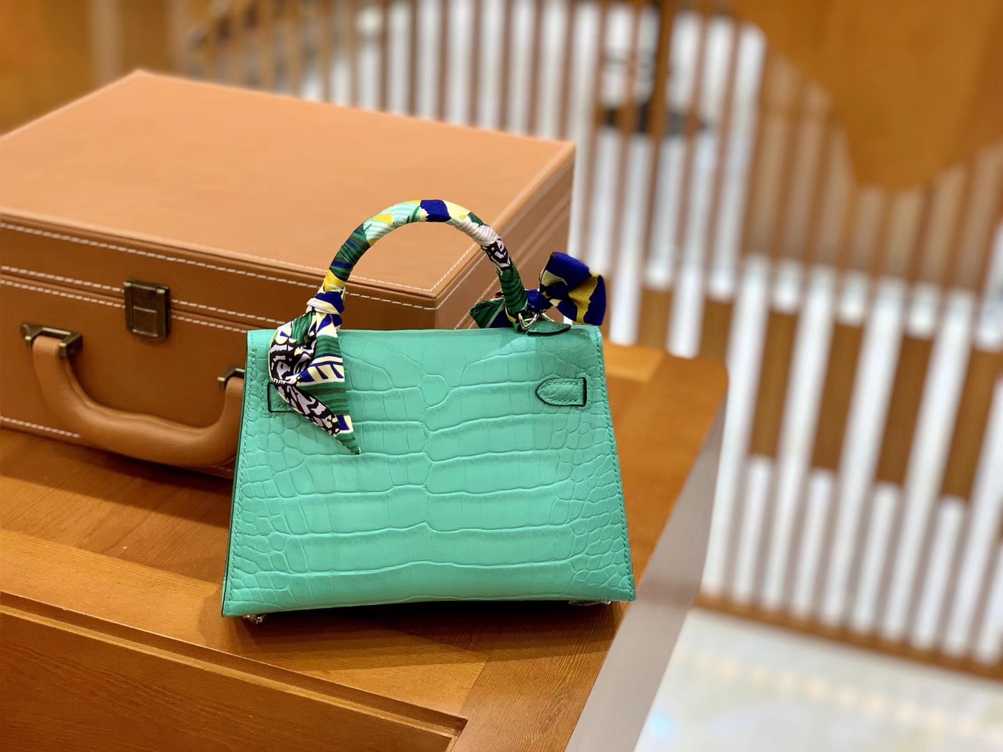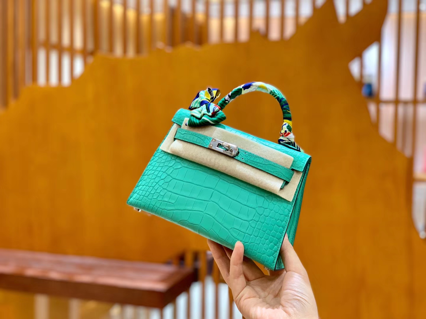 Hermès(爱马仕)Mini Kelly 19cm 薄荷绿 银扣 哑光 美洲鳄鱼皮 全手工缝制 2019年12月27日 0 【鳄鱼世家】www.Eyubao.com Mini Kelly 2 Mini Kelly 迷你凯莉 品牌:Hermès(爱马仕);类别:Mini Kelly迷你凯莉包;颜色:薄荷绿;材质:哑光 美洲鳄鱼皮;等级:顶级;附件:全套包装礼盒;尺寸:19cm;功能:手提单肩包