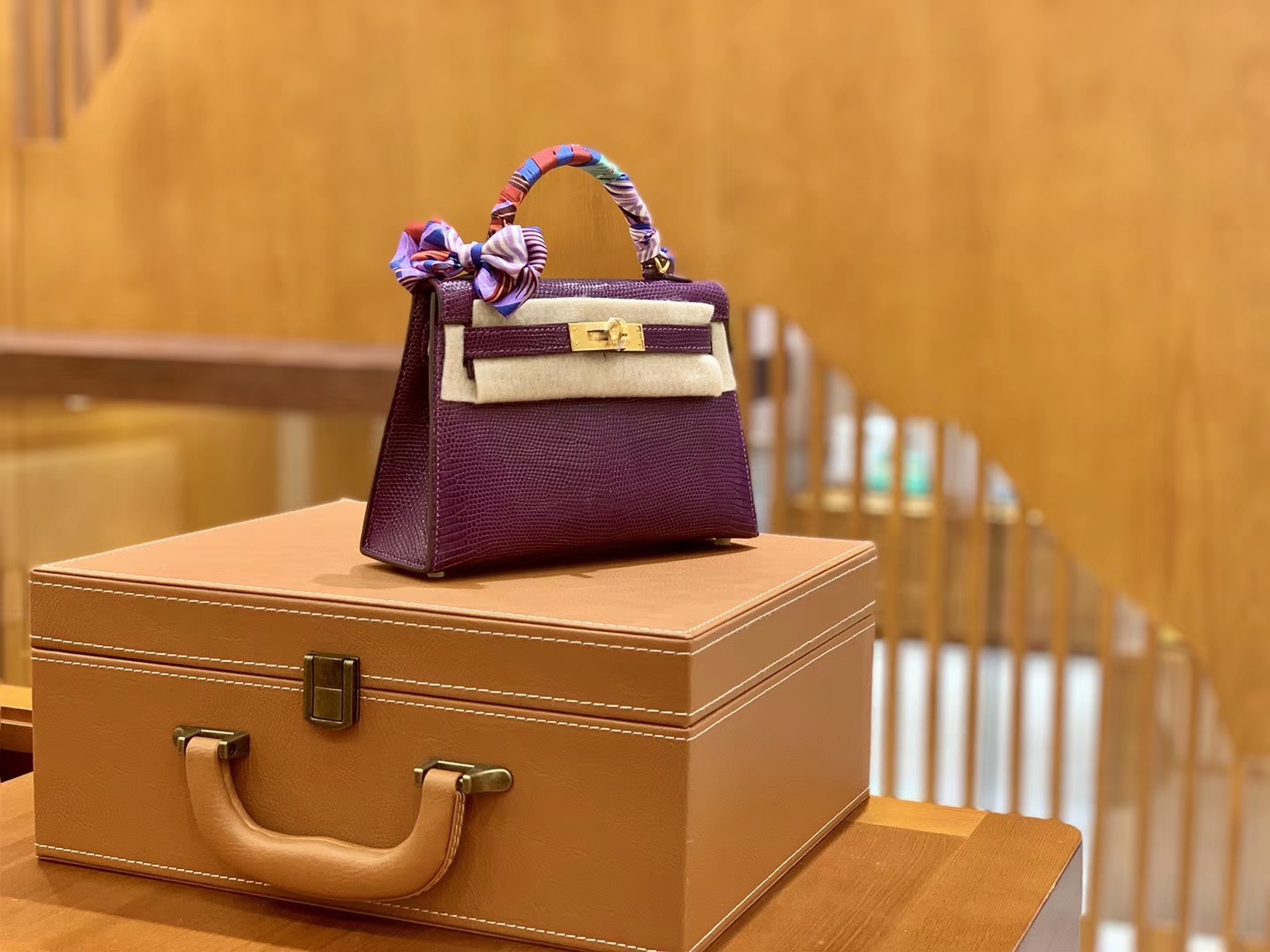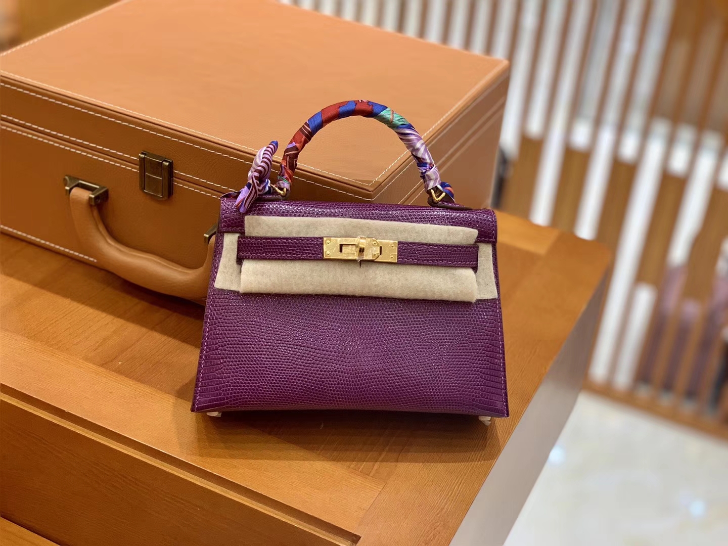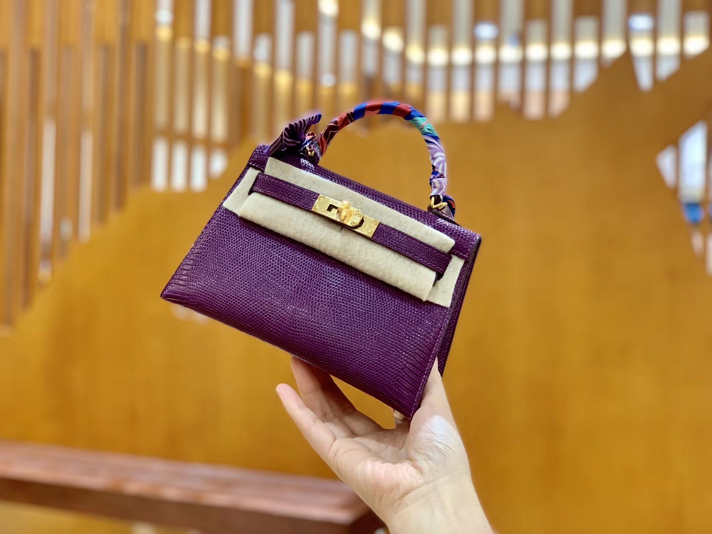 品牌:Hermès(爱马仕);类别:Mini Kelly迷你凯莉包;颜色:水晶紫;材质:蜥蜴皮;等级:顶级;附件:全套包装礼盒;尺寸:19cm;功能:手提单肩包
