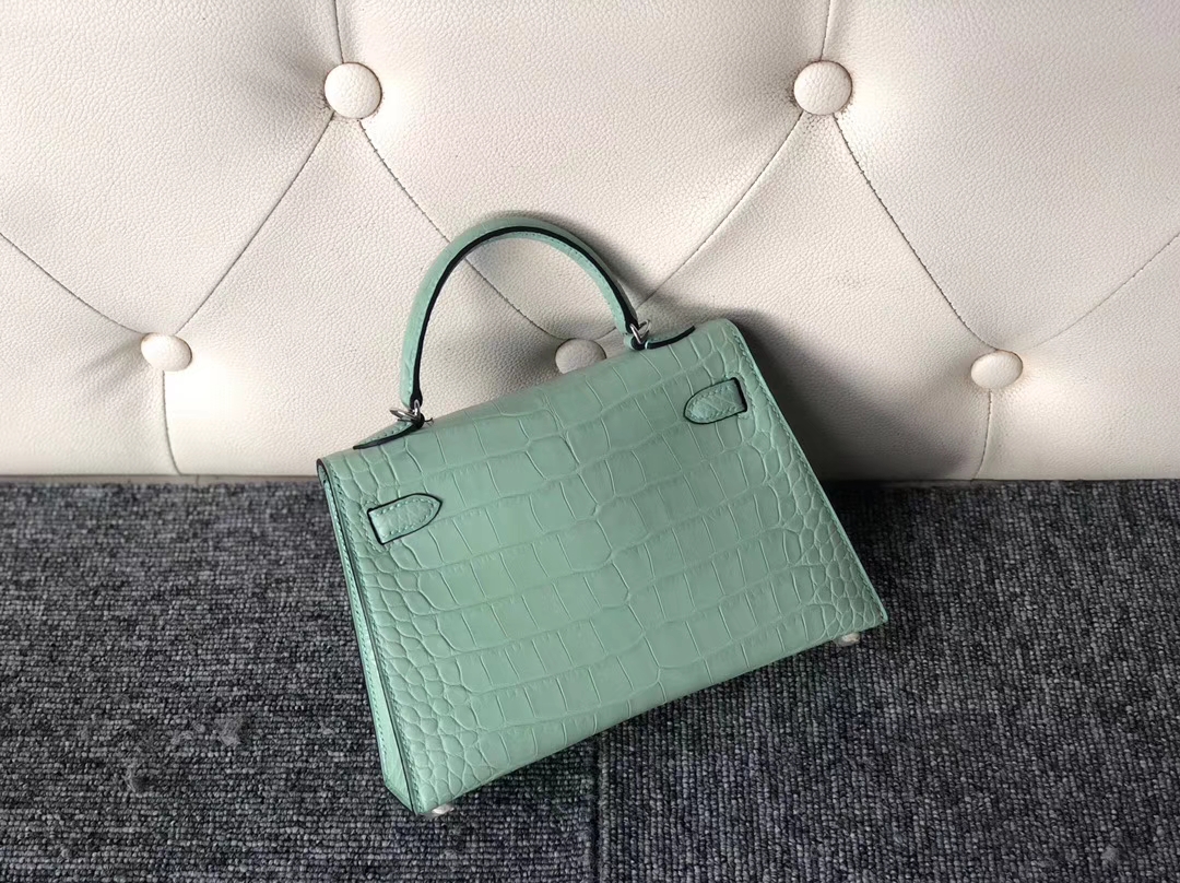 Hermès(爱马仕)Minikelly ll Alligator matt 雾面鳄鱼 薄荷绿 银扣 顶级手缝 小可爱 现货 2020年1月9日 0 【鳄鱼世家】www.Eyubao.com Mini Kelly 2 Mini Kelly 迷你凯莉 品牌:Hermès(爱马仕);类别:Mini Kelly迷你凯莉包;颜色:薄荷绿;材质:雾面鳄鱼;等级:顶级;附件:全套包装礼盒;尺寸:19cm;功能:手提单肩包