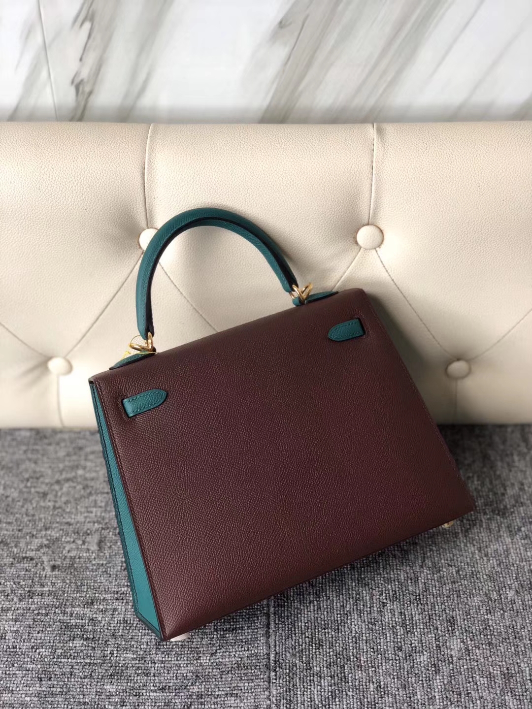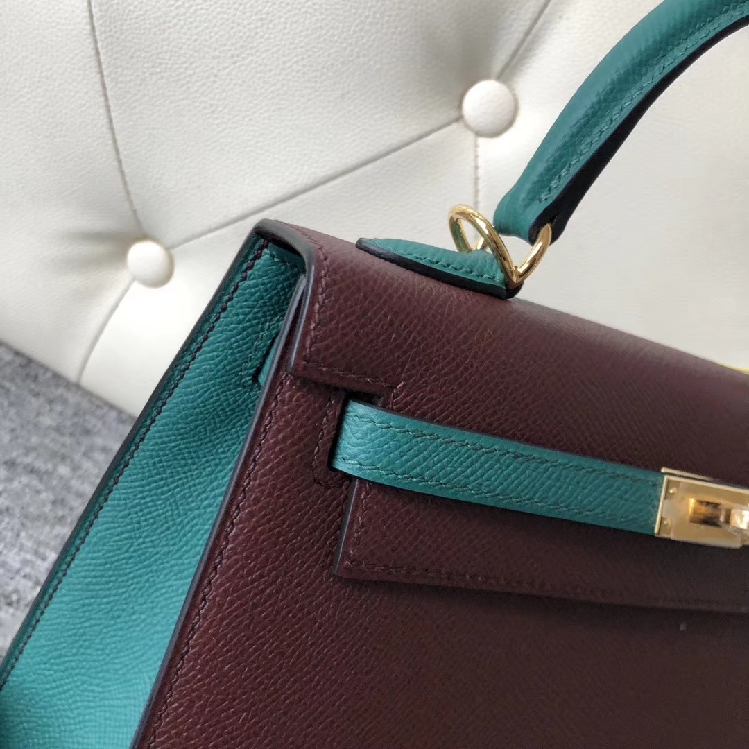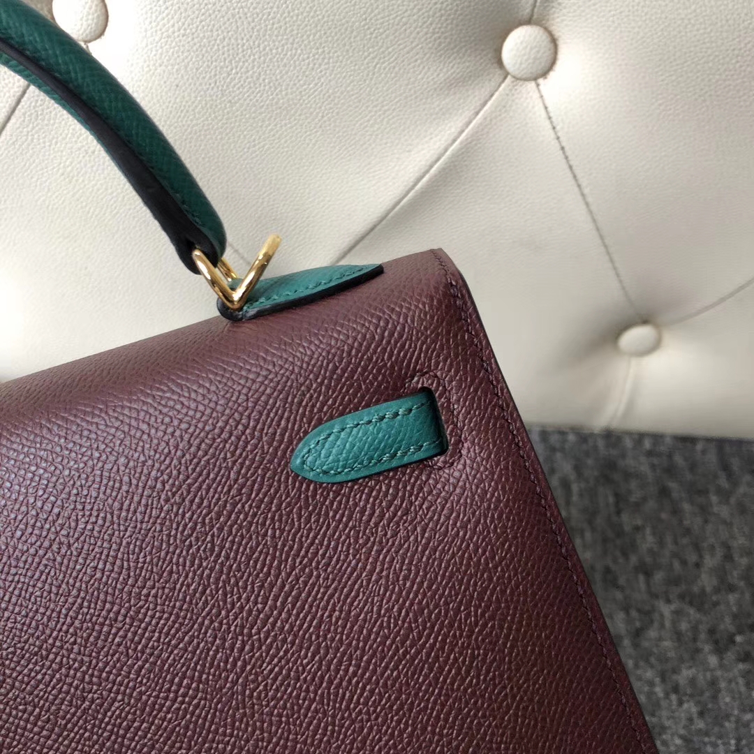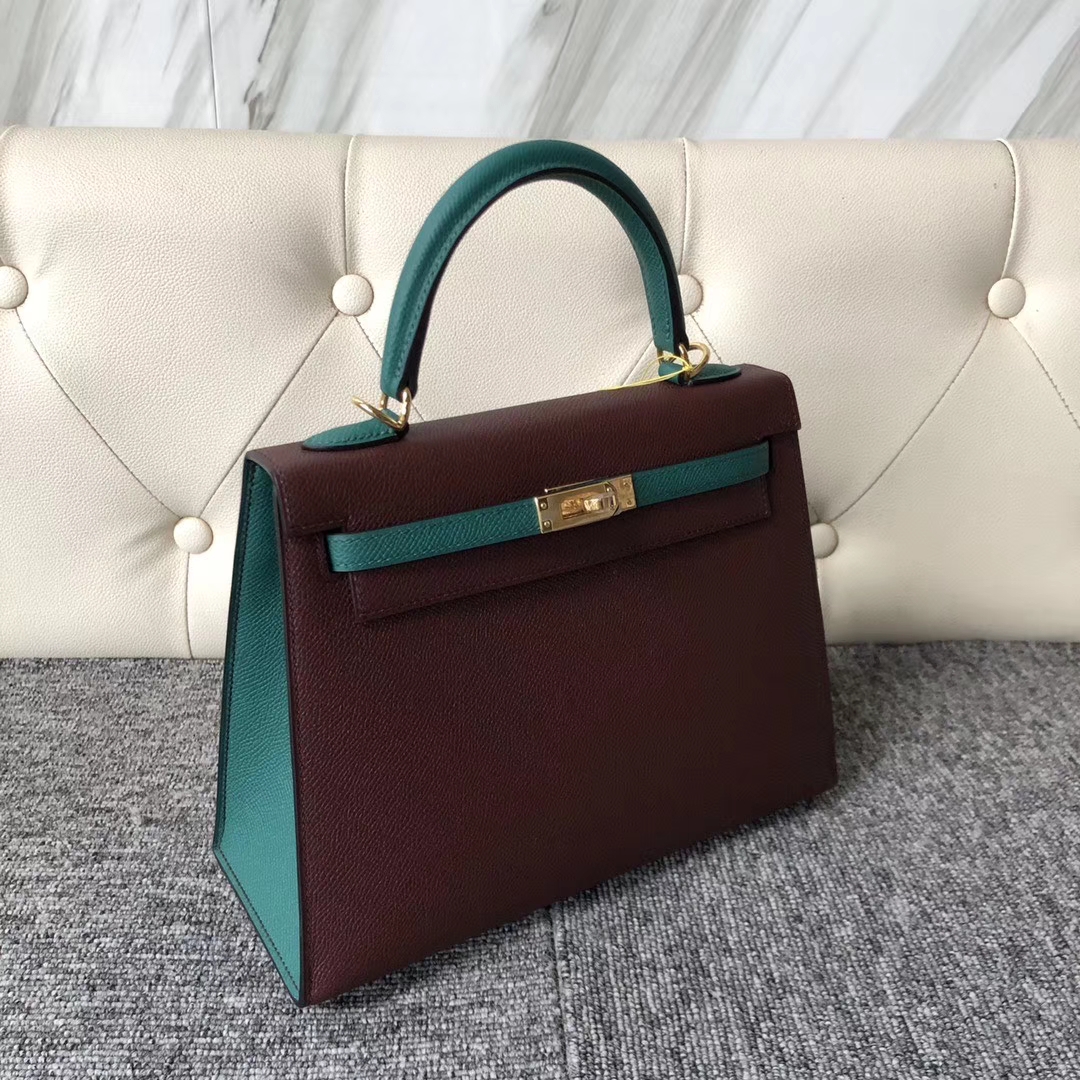 Hermès(爱马仕)Kelly 25cm Epsom 原厂掌纹皮 ck57 波尔多酒红 z6 孔雀绿 金扣 马蹄印 2020年1月13日 0 【鳄鱼世家】www.Eyubao.com Kelly 25 Kelly 凯莉包 品牌:Hermès(爱马仕);类别:Kelly 凯莉包;颜色:波尔多酒红 拼 孔雀绿;材质:原厂掌纹皮;等级:顶级;附件:全套包装礼盒;尺寸: 25cm;功能:手提单肩包