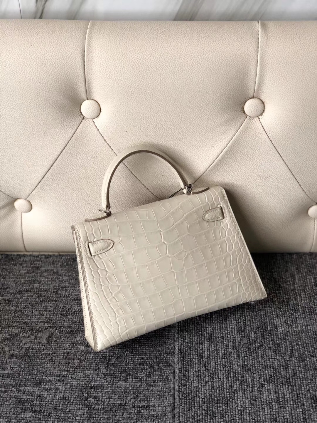 Hermès(爱马仕)Minikelly ll 雾面鳄鱼 8L 奶油白 Beton 银扣 顶级手缝 现货 2020年1月13日 0 【鳄鱼世家】www.Eyubao.com Mini Kelly 2 Mini Kelly 迷你凯莉 品牌:Hermès(爱马仕);类别:Mini Kelly迷你凯莉包;颜色:奶油白;材质:美洲雾面鳄鱼皮;等级:顶级;附件:全套包装礼盒;尺寸:19cm;功能:手提单肩包