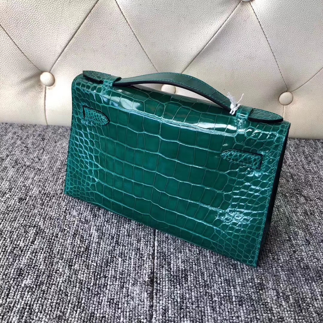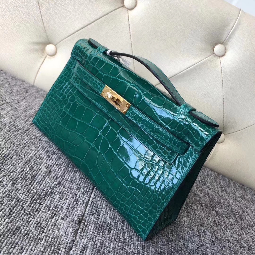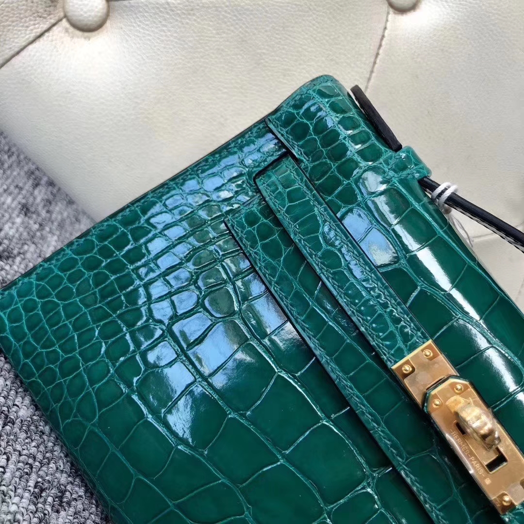 Hermès(爱马仕)Mini Kelly Pochette 22cm 亮面方块 美洲鳄鱼 6Q翡翠绿 Vert Emeraude 金扣