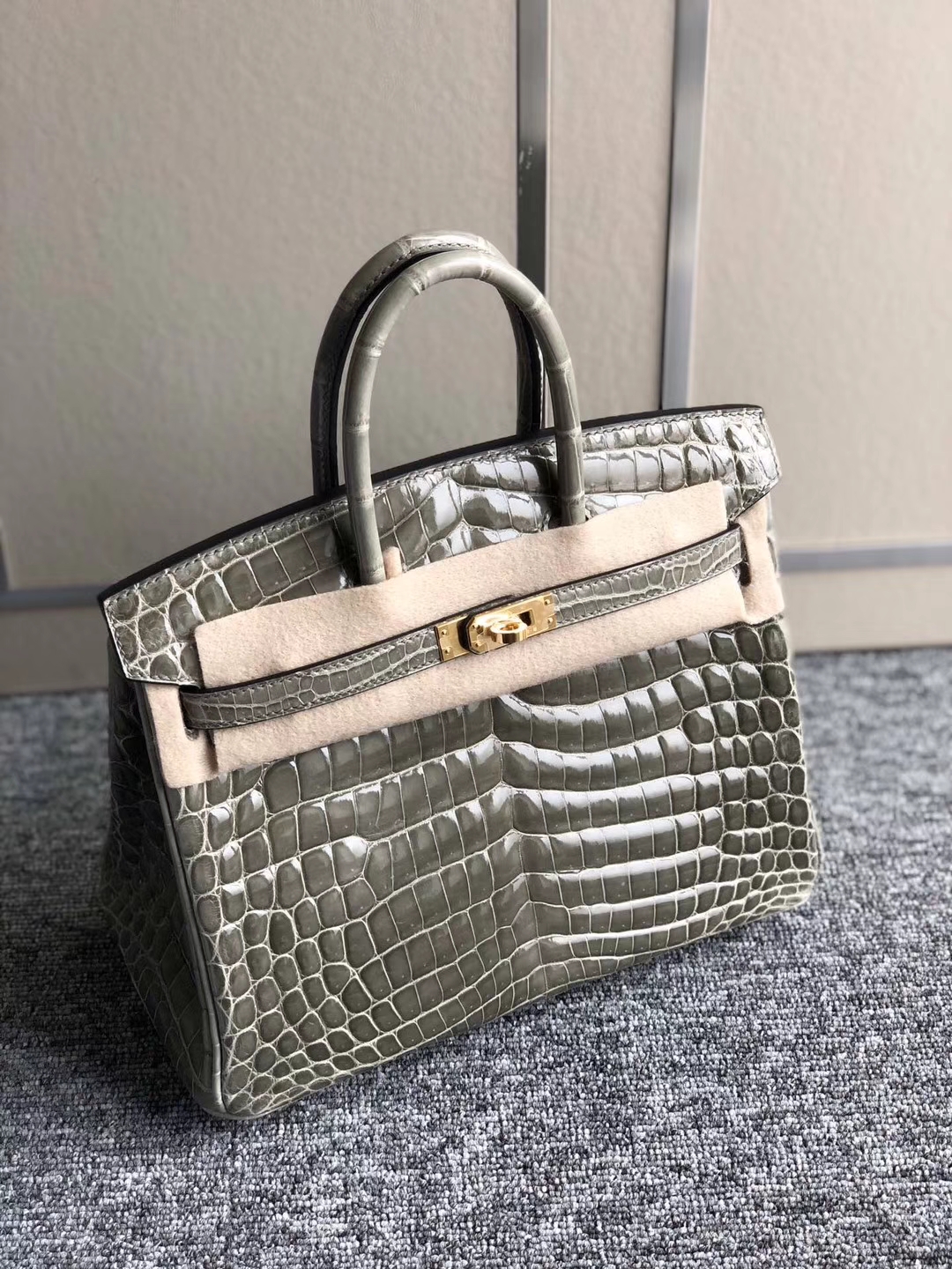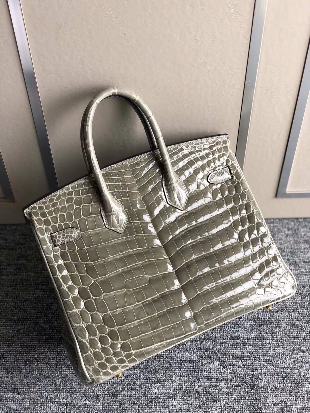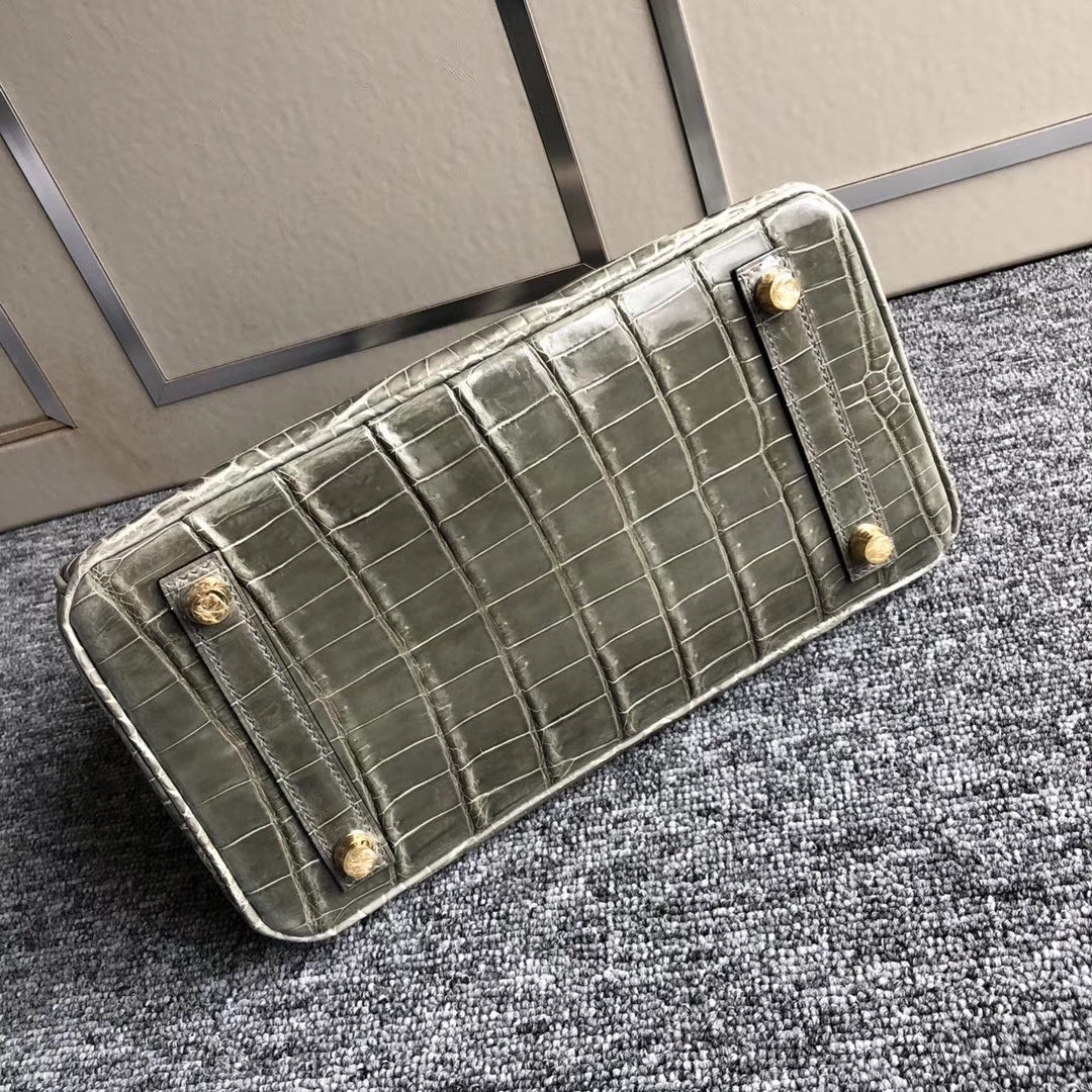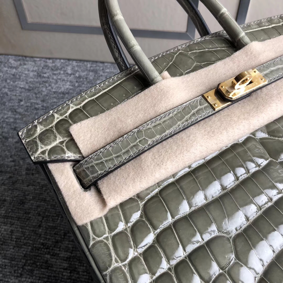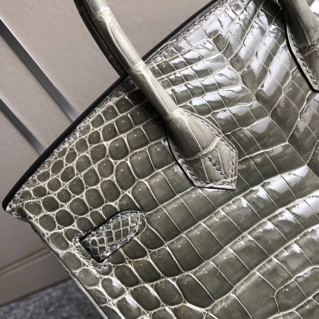 Hermès(爱马仕)Birkin 25cm Crocodile shiny 亮面鳄鱼 ck81 斑鸠灰 Gris T 金扣 拱珠 现货 2020年1月14日 0 【鳄鱼世家】www.Eyubao.com Birkin 25 Birkin 铂金包 品牌:Hermès(爱马仕);类别:Birkin 铂金包;颜色:斑鸠灰;材质:亮面鳄鱼皮;等级:顶级;附件:全套包装礼盒;尺寸:25cm;功能:手提单肩包