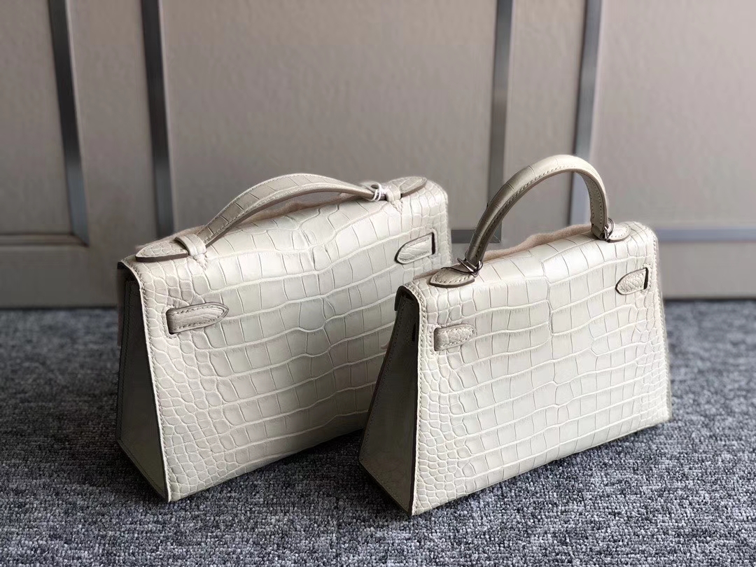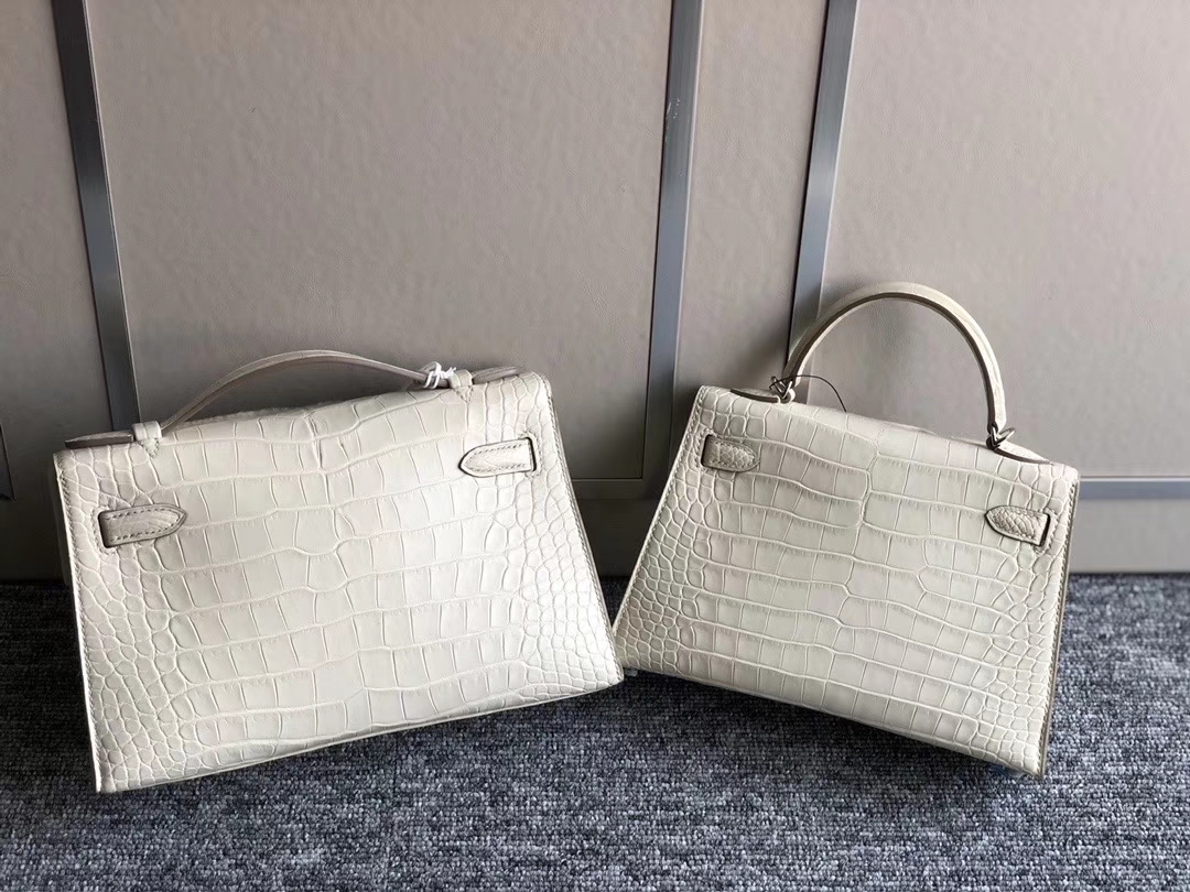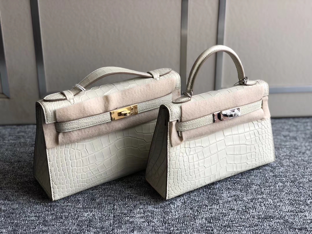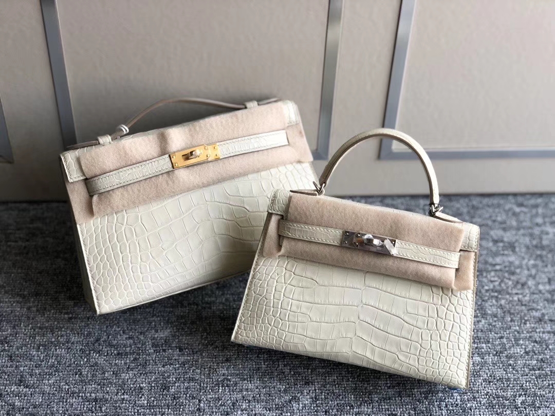 Hermès(爱马仕)Mini kelly pochette 22cm 雾面鳄鱼 8L 奶油白 Beton 金扣 银扣 2020年2月28日 0 【鳄鱼世家】www.Eyubao.com Mini Kelly 1 Mini Kelly 2 Mini Kelly 迷你凯莉 品牌:Hermès(爱马仕);类别:Mini Kelly迷你凯莉包;颜色:奶油白;材质:雾面鳄鱼;等级:顶级;附件:全套包装礼盒;尺寸:19cm/22cm;功能:手提单肩包