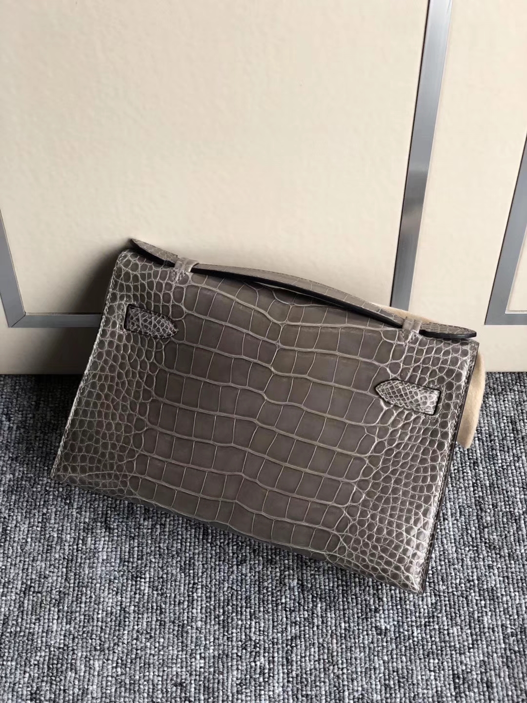 Hermès(爱马仕)Mini kelly pochette 22cm 亮面鳄鱼 ck81 斑鸠灰 金扣 手拿包 晚宴包 现货 2020年3月3日 0 【鳄鱼世家】www.Eyubao.com Mini Kelly 1 Mini Kelly 迷你凯莉 品牌:Hermès(爱马仕);类别:Mini Kelly迷你凯莉包;颜色:斑鸠灰;材质:亮面鳄鱼;等级:顶级;附件:全套包装礼盒;尺寸:22cm;功能:手提单肩包