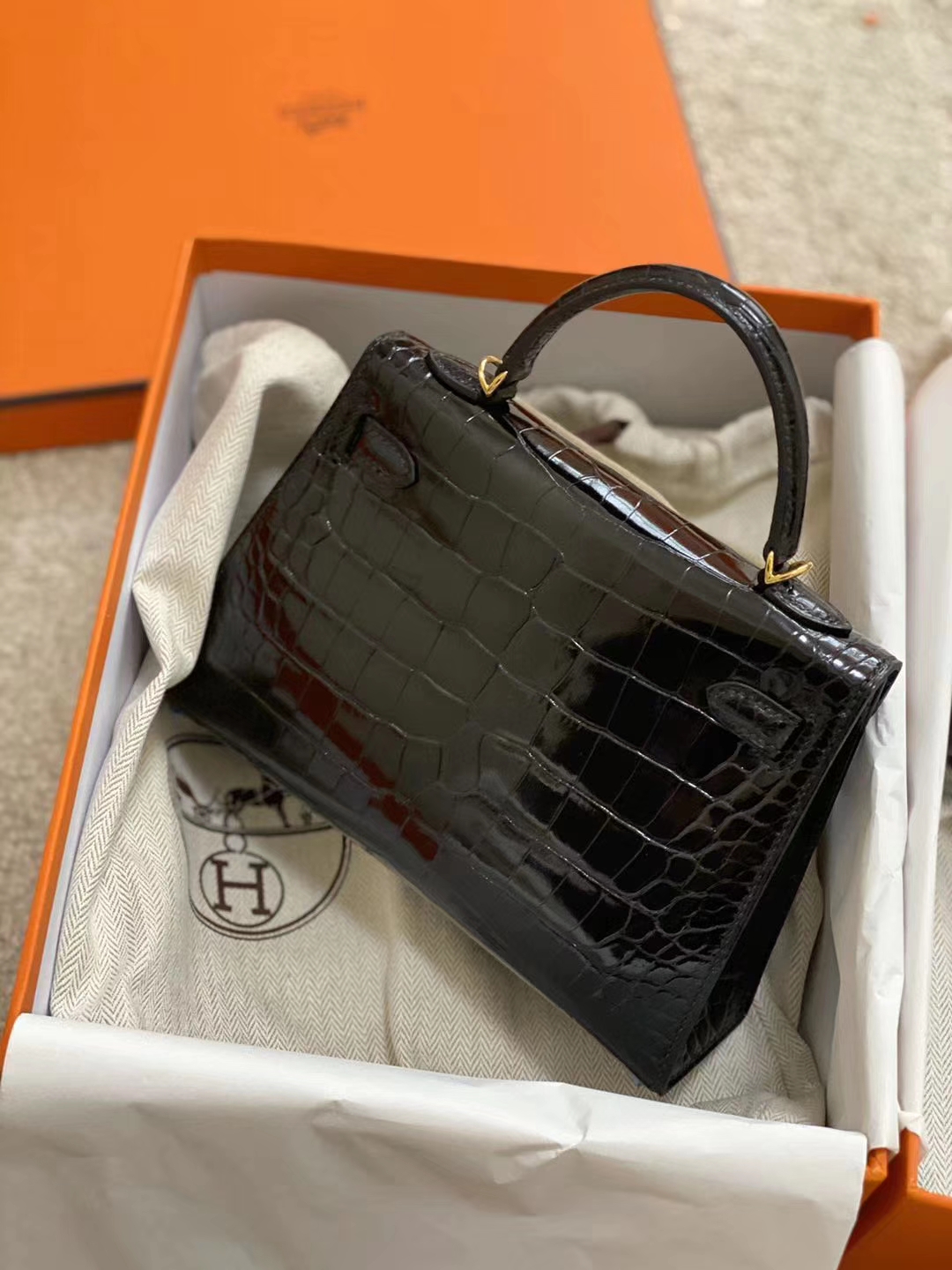 Hermès(爱马仕)Kelly 2代 19cm shiny alligator crocodile 亮面美洲鳄 ck89黑色 蜡线全手工 金扣 2020年3月7日 0 【鳄鱼世家】www.Eyubao.com Mini Kelly 2 Mini Kelly 迷你凯莉 品牌:Hermès(爱马仕);类别:Mini Kelly迷你凯莉包;颜色:黑色;材质:亮面美洲鳄;等级:顶级;附件:全套包装礼盒;尺寸:19cm;功能:手提单肩包