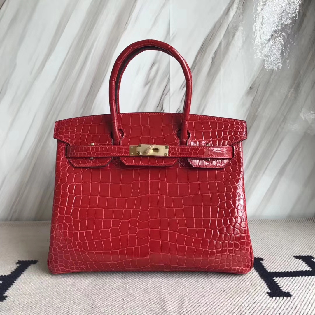 Hermès(爱马仕)Birkin30cm Porosus shiny 亮面澳洲湾鳄 ck95 法拉利红 Braise 金扣 现货