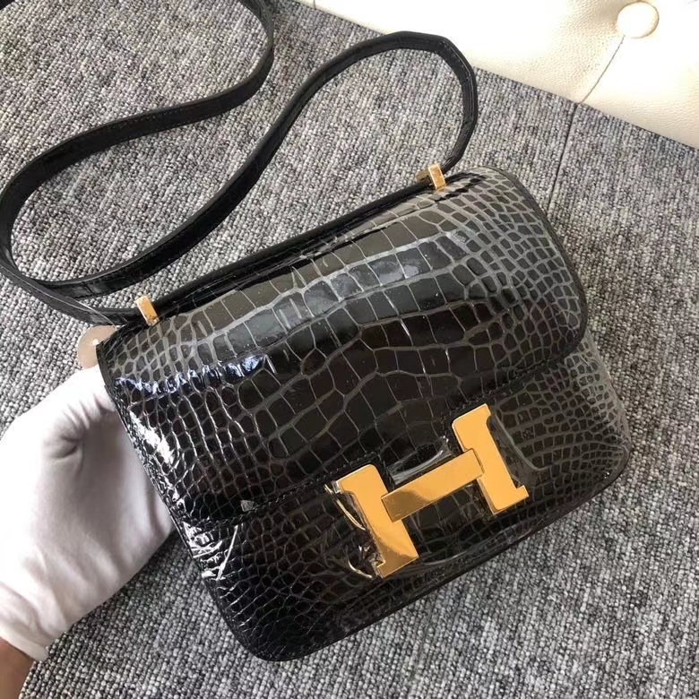 Constance 19 Constance 空姐包 Niloticus 尼罗鳄 Hermès(爱马仕)Constance 空姐包 shiny alligator crocodile 亮面鳄鱼 Ck89黑色 蜡线全缝 金扣 19cm 2020年6月20日 0