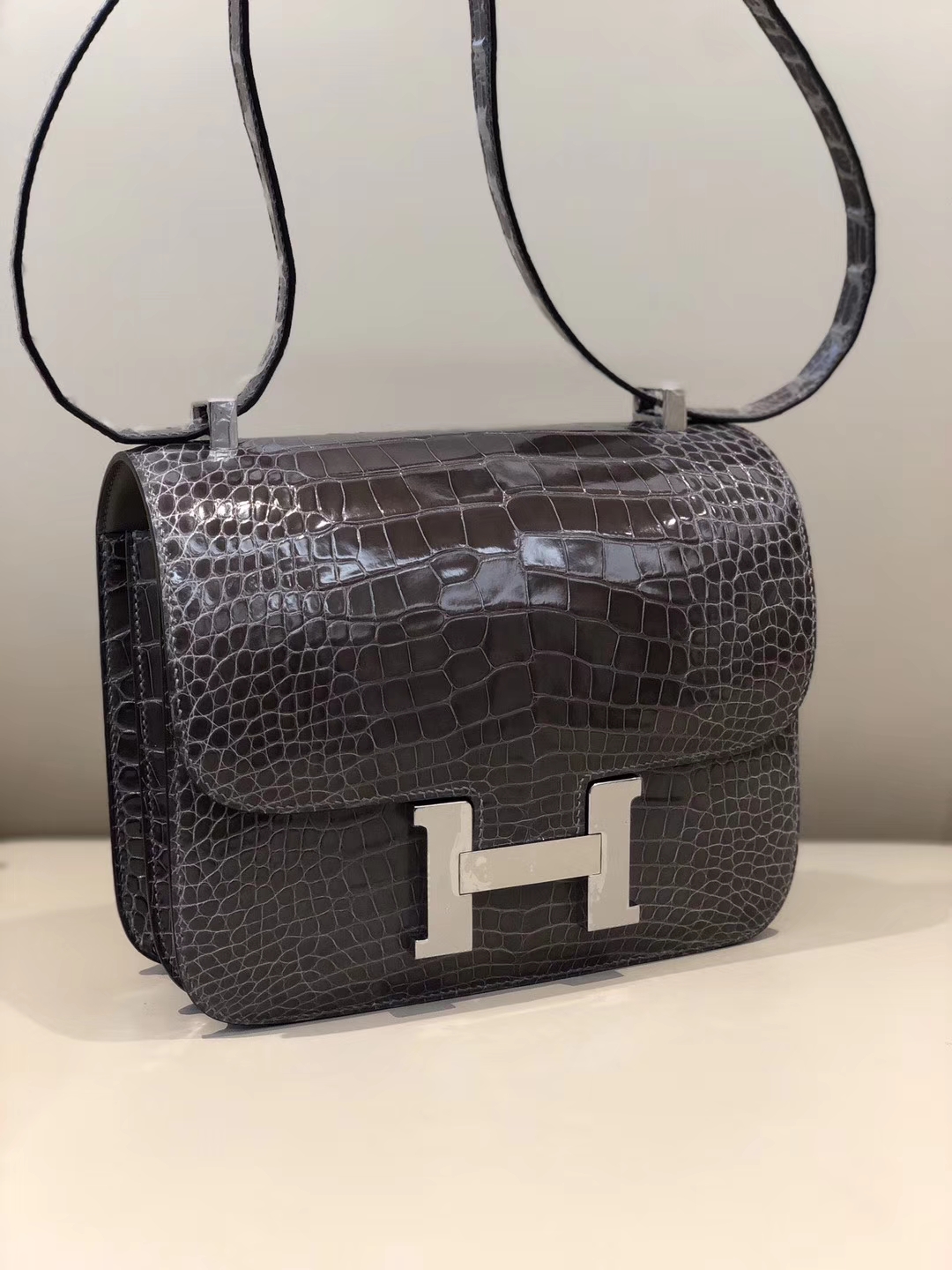 Constance 24 Constance 空姐包 Hermès(爱马仕)Constance 空姐包 24cm Alligator shiny 亮面鳄鱼 ck88 石墨灰 Graphite 银扣 现货 2020年2月18日 0