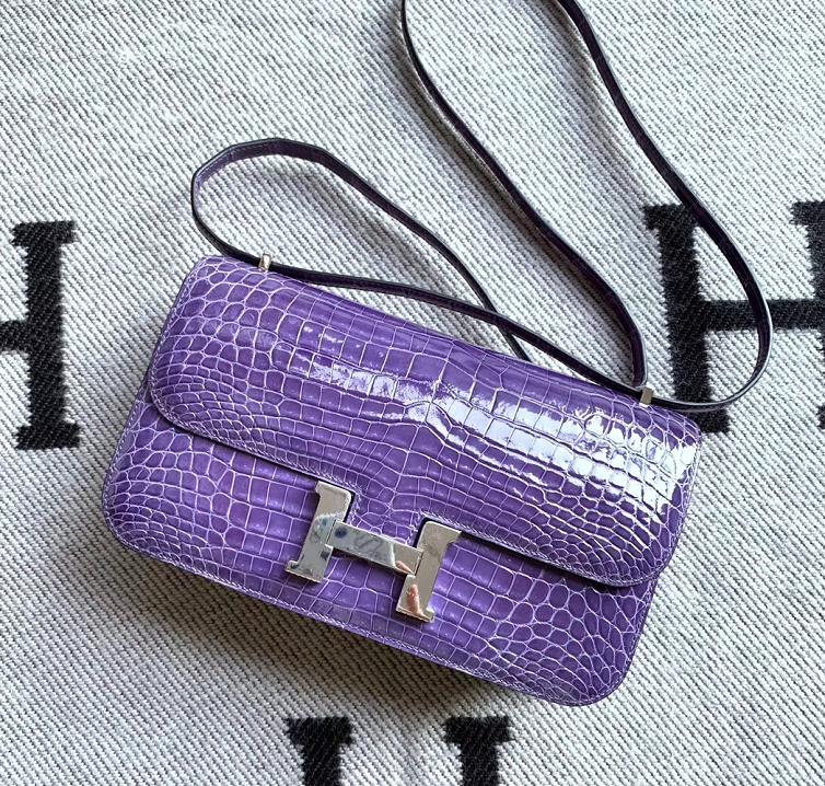 Hermès(爱马仕)Constance空姐包 水晶紫亮面鳄鱼皮 银扣 26cm