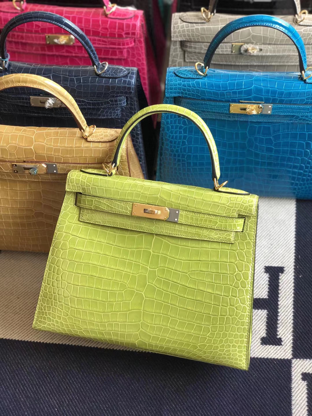Hermès(爱马仕)Kelly 凯莉包 crocodile 亮面湾鳄 奇异果绿 顶级工艺 蜡线全手工 金扣 28cm