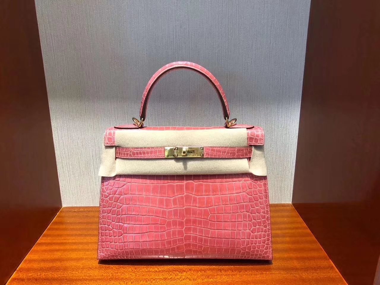 Hermès(爱马仕)Kelly 28cm porosus shiny 亮面澳洲湾鳄 5L 龙虾粉 金扣 顶级手缝