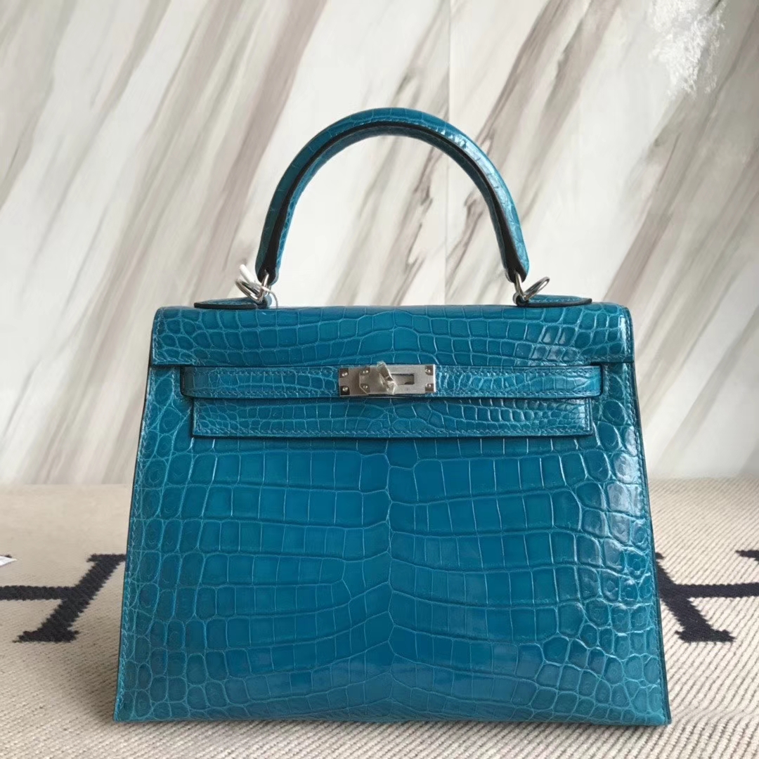 Hermès(爱马仕)Kelly 25cm Crocodile 亮面鳄鱼 7w 伊兹密尔蓝 银扣 顶级手缝 现货