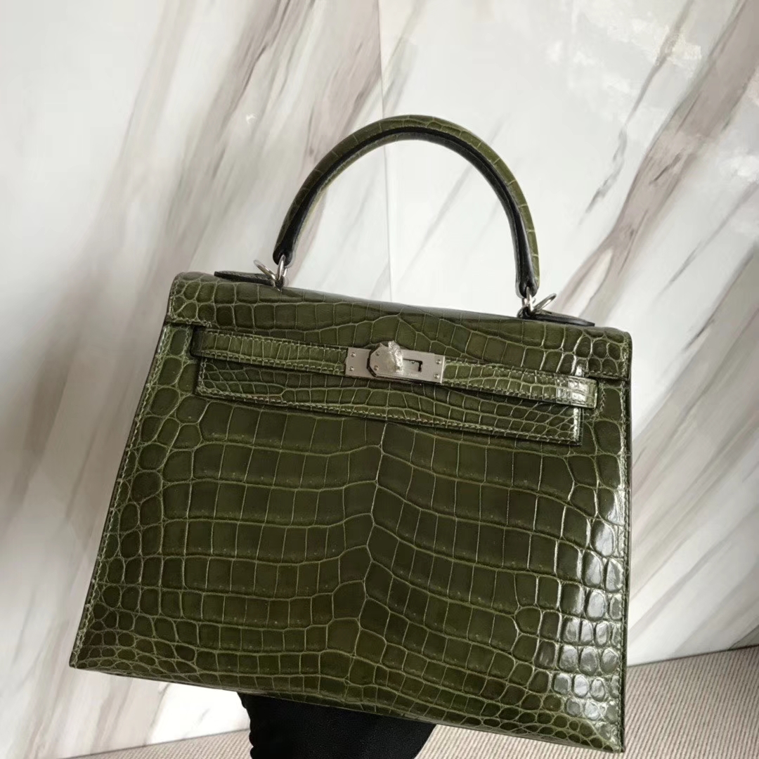 Hermès(爱马仕)Kelly 25cm Crocodile shiny 亮面鳄鱼 6H橄榄绿 银扣 顶级手缝 现货
