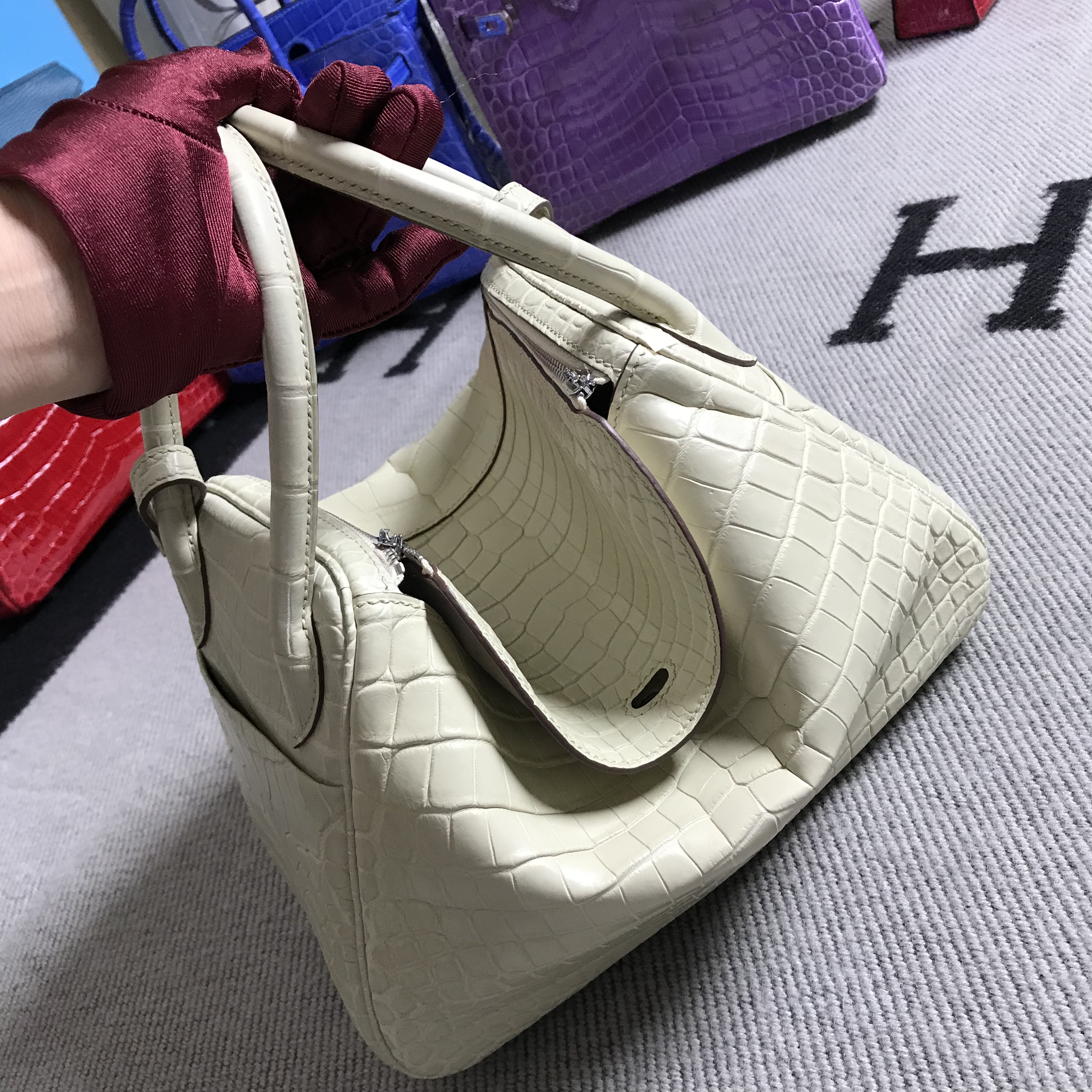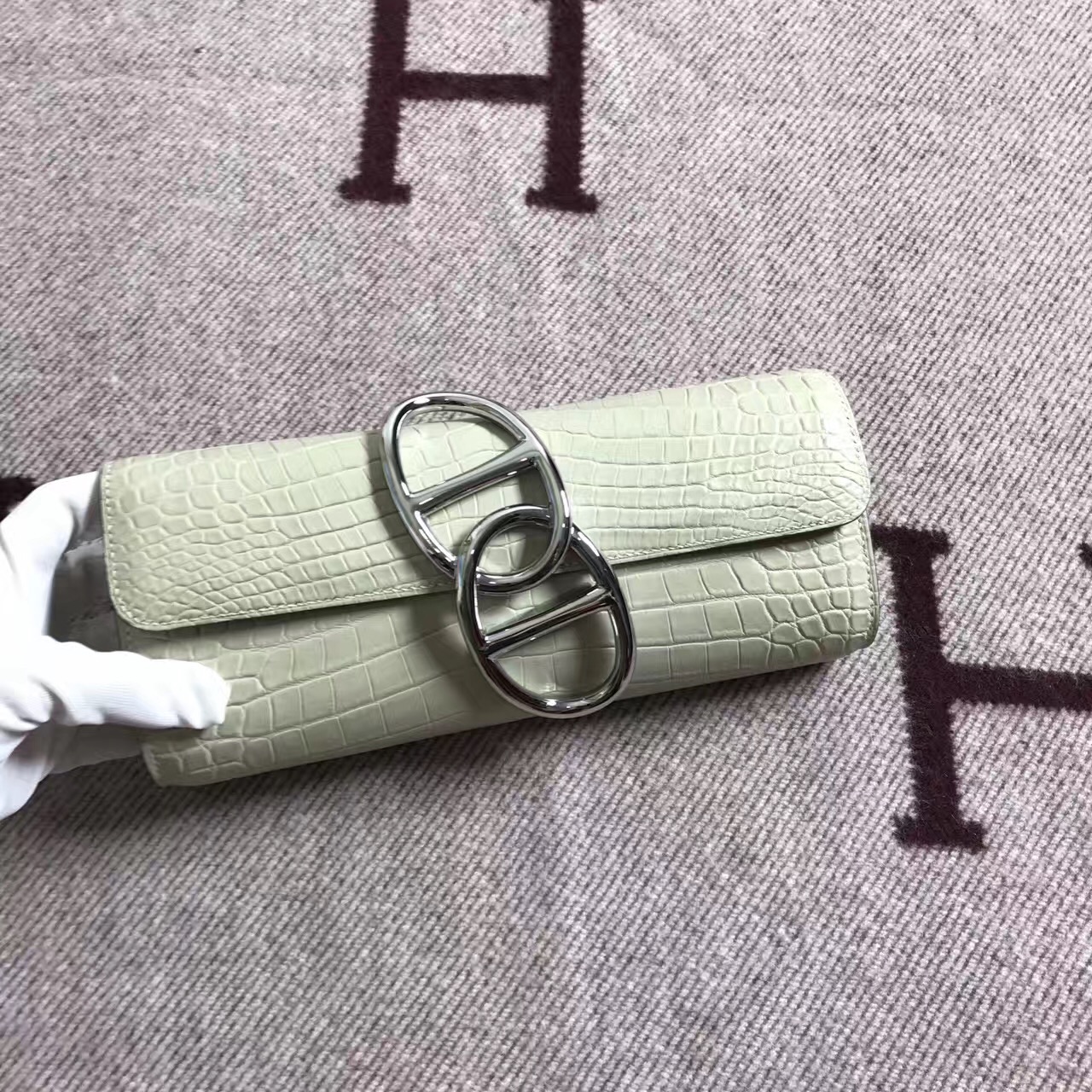Hermès(爱马仕)猪鼻手包egee 鳄鱼亚光 米灰 银扣