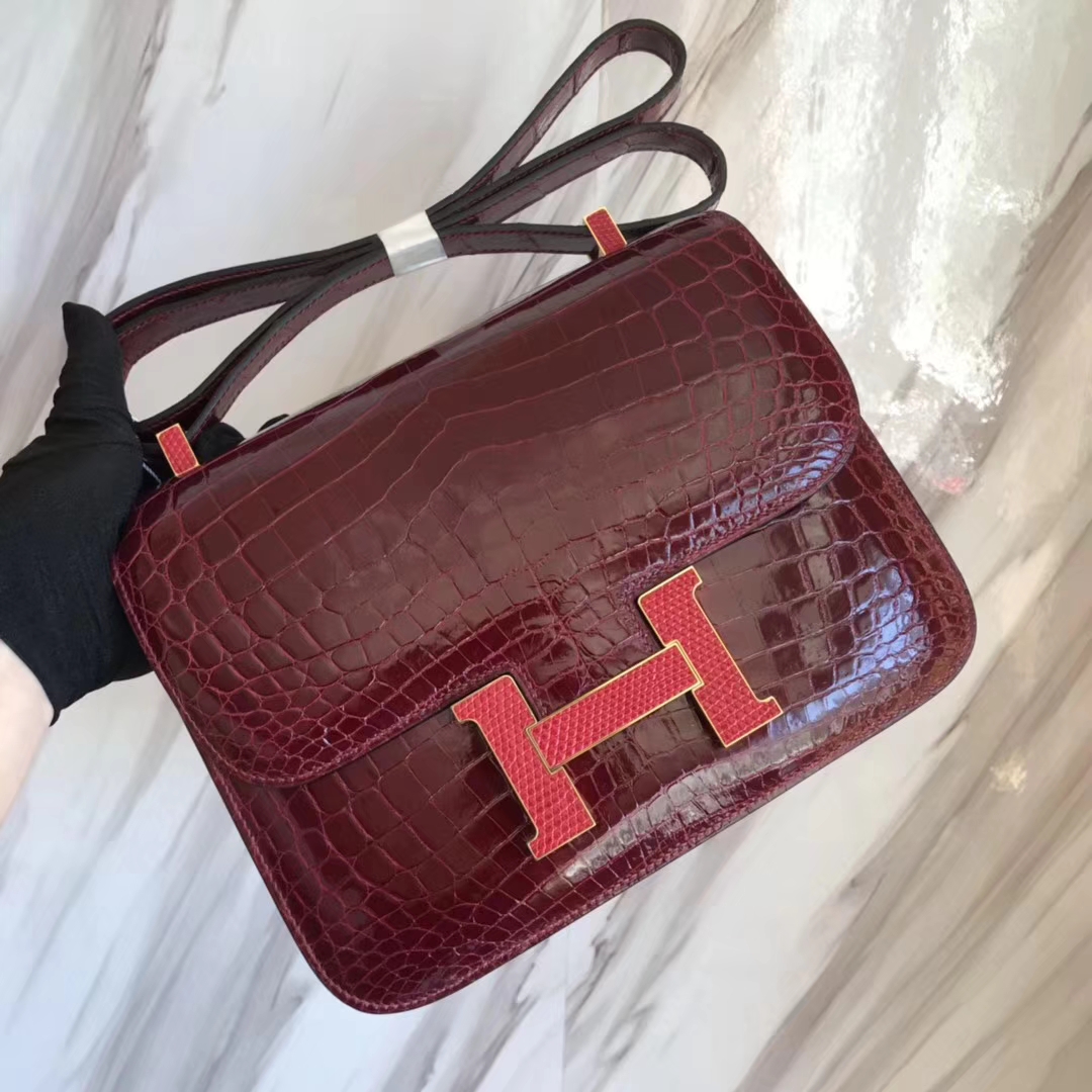 Constance 24 Constance 空姐包 Hermès(爱马仕)Constance24cm Crocodile shiny 亮面鳄鱼 F5 新酒红 勃艮第酒红 蜥蜴扣 金扣 2018年10月28日 0