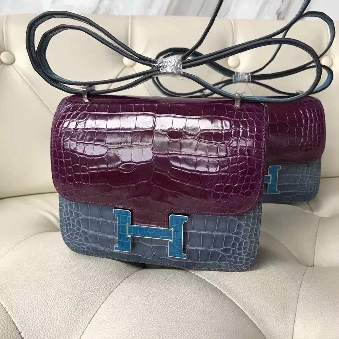 Constance 18 Constance 空姐包 Hermès(爱马仕)Constance18cm Crocodile shiny 亮面鳄鱼 三拼 加伦紫拼牛仔蓝拼伊兹密尔蓝 鳄鱼扣 2018年11月13日 0