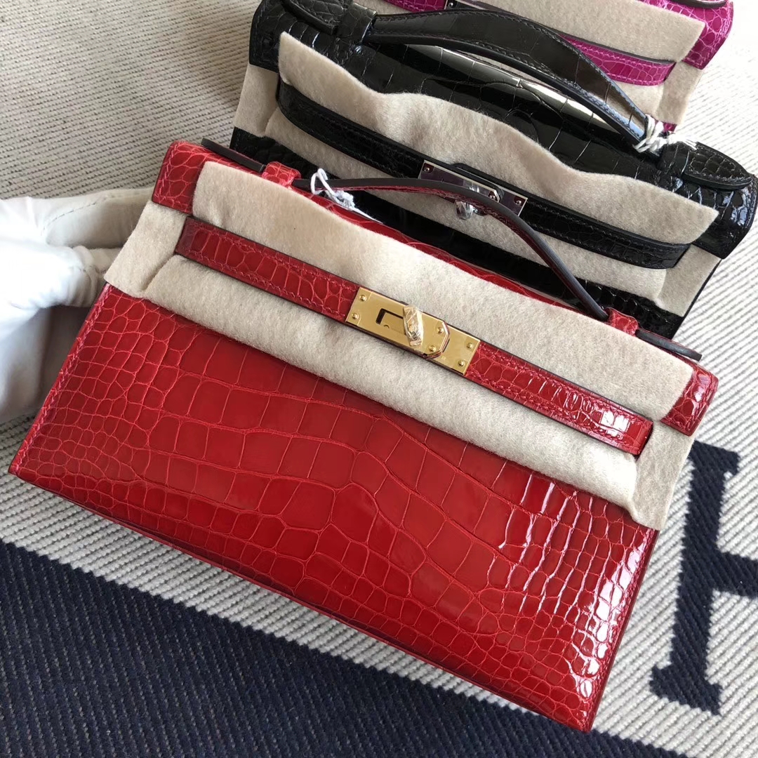 Hermès(爱马仕)Minikelly pochette 22cm 亮面鳄鱼 ck95 法拉利红 Braise 金扣 手拿包 晚宴包